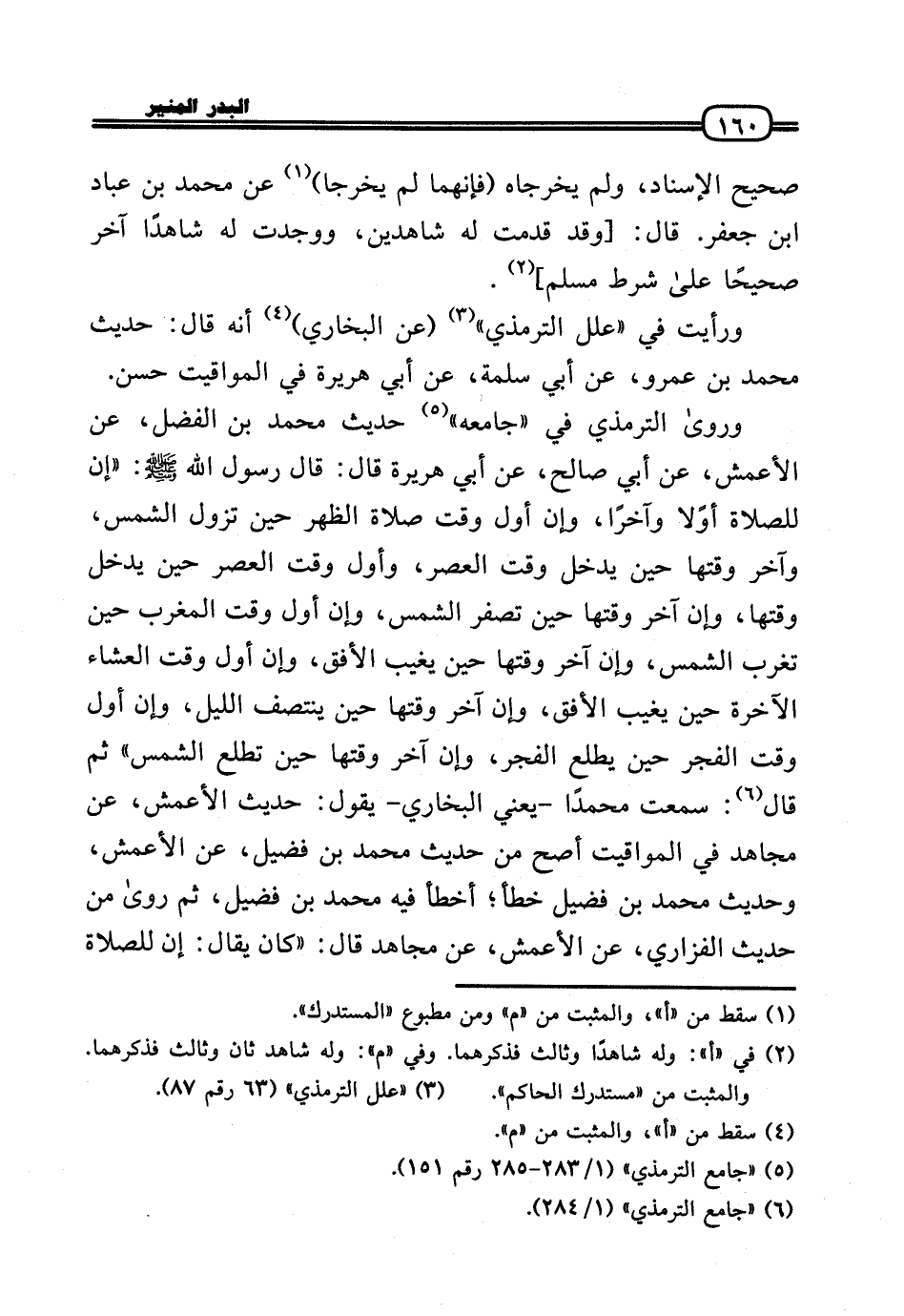 وَرَوَى التِّرْمِذِيّ فِي «جَامعه» حَدِيث مُحَمَّد بن الْفضل، عَن الْأَعْمَش، عَن أبي صَالح، عَن أبي هُرَيْرَة قَالَ: قَالَ رَسُول الله - صَلَّى الله عَلَيْهِ وَسلم -: «إِن للصَّلَاة أَولا وآخرًا، وَإِن أول وَقت صَلَاة الظّهْر حِين تَزُول الشَّمْس، وَآخر وَقتهَا حِين يدْخل وَقت الْعَصْر، وَأول وَقت الْعَصْر حِين يدْخل وَقتهَا، وَإِن آخر وَقتهَا حِين تصفر الشَّمْس، وَإِن أول وَقت الْمغرب حِين تغرب الشَّمْس، وَإِن آخر وَقتهَا حِين يغيب الْأُفق، وَإِن أول وَقت الْعشَاء الْآخِرَة حِين يغيب الْأُفق، وَإِن آخر وَقتهَا حِين ينتصف اللَّيْل، وَإِن أول وَقت الْفجْر حِين يطلع الْفجْر، وَإِن آخر وَقتهَا حِين تطلع الشَّمْس» ثمَّ قَالَ: سَمِعت مُحَمَّدًا - يَعْنِي البُخَارِيّ - يَقُول: حَدِيث الْأَعْمَش، عَن مُجَاهِد فِي الْمَوَاقِيت أصح من حَدِيث مُحَمَّد بن فُضَيْل، عَن الْأَعْمَش، وَحَدِيث مُحَمَّد بن فُضَيْل خطأ؛ أَخطَأ فِيهِ مُحَمَّد بن فُضَيْل، ثمَّ رَوَى من حَدِيث الْفَزارِيّ، عَن الْأَعْمَش، عَن مُجَاهِد قَالَ: «كَانَ يُقَال: إِن للصَّلَاة