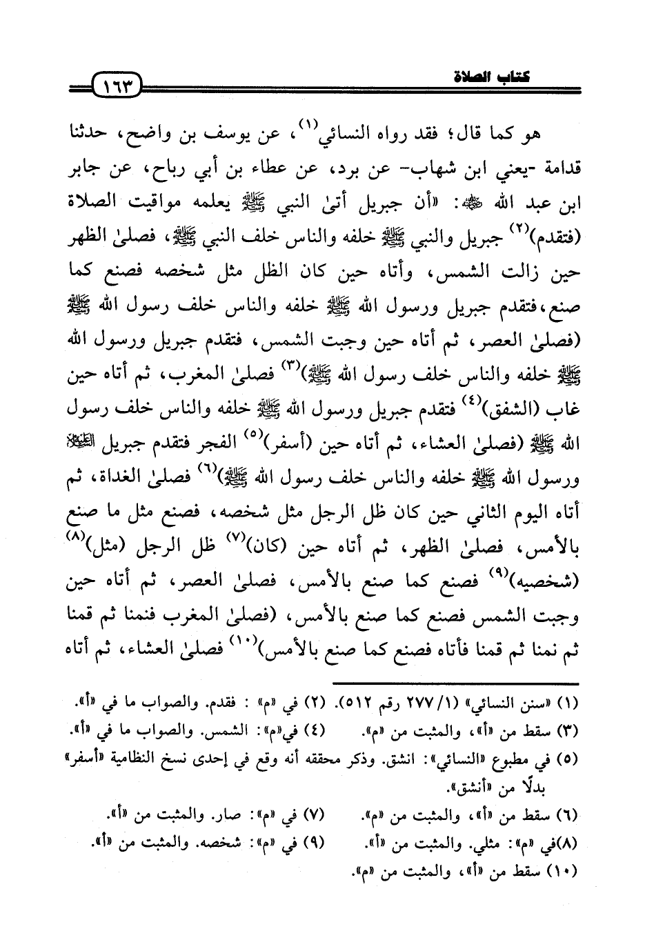 هُوَ كَمَا قَالَ؛ فقد رَوَاهُ النَّسَائِيّ، عَن يُوسُف بن وَاضح، حَدثنَا قدامَة - يَعْنِي ابْن شهَاب - عَن برد، عَن عَطاء بن أبي رَبَاح، عَن جَابر بن عبد الله رَضِيَ اللَّهُ عَنْه: «أَن جِبْرِيل أَتَى النَّبِي - صَلَّى الله عَلَيْهِ وَسلم - يُعلمهُ مَوَاقِيت الصَّلَاة (فَتقدم) جِبْرِيل وَالنَّبِيّ - صَلَّى الله عَلَيْهِ وَسلم - خَلفه وَالنَّاس خلف النَّبِي - صَلَّى الله عَلَيْهِ وَسلم -، فَصَلى الظّهْر حِين زَالَت الشَّمْس، وَأَتَاهُ حِين كَانَ الظل مثل شخصه فَصنعَ كَمَا صنع، فَتقدم جِبْرِيل وَرَسُول الله - صَلَّى الله عَلَيْهِ وَسلم - خَلفه وَالنَّاس خلف رَسُول الله - صَلَّى الله عَلَيْهِ وَسلم - (فَصَلى الْعَصْر، ثمَّ أَتَاهُ حِين وَجَبت الشَّمْس، فَتقدم جِبْرِيل وَرَسُول الله - صَلَّى الله عَلَيْهِ وَسلم - خَلفه وَالنَّاس خلف رَسُول الله - صَلَّى الله عَلَيْهِ وَسلم -) فَصَلى الْمغرب، ثمَّ أَتَاهُ حِين غَابَ (الشَّفق) فَتقدم جِبْرِيل وَرَسُول الله - صَلَّى الله عَلَيْهِ وَسلم - خَلفه وَالنَّاس خلف رَسُول الله - صَلَّى الله عَلَيْهِ وَسلم - (فَصَلى الْعشَاء، ثمَّ أَتَاهُ حِين (أَسْفر) الْفجْر فَتقدم جِبْرِيل عَلَيْهِ السَّلَام وَرَسُول الله - صَلَّى الله عَلَيْهِ وَسلم - خَلفه وَالنَّاس خلف رَسُول الله - صَلَّى الله عَلَيْهِ وَسلم -) فَصَلى الْغَدَاة، ثمَّ أَتَاهُ الْيَوْم الثَّانِي حِين كَانَ ظلّ الرجل مثل شخصه، فَصنعَ مثل مَا صنع بالْأَمْس، فَصَلى الظّهْر، ثمَّ أَتَاهُ حِين (كَانَ) ظلّ الرجل (مثل) (شخصيه) فَصنعَ كَمَا صنع بالْأَمْس، فَصَلى الْعَصْر، ثمَّ أَتَاهُ حِين وَجَبت الشَّمْس فَصنعَ كَمَا صنع بالْأَمْس، (فَصَلى الْمغرب فنمنا ثمَّ قمنا ثمَّ نمنا ثمَّ قمنا فَأَتَاهُ فَصنعَ كَمَا صنع بالْأَمْس) فَصَلى الْعشَاء، ثمَّ أَتَاهُ