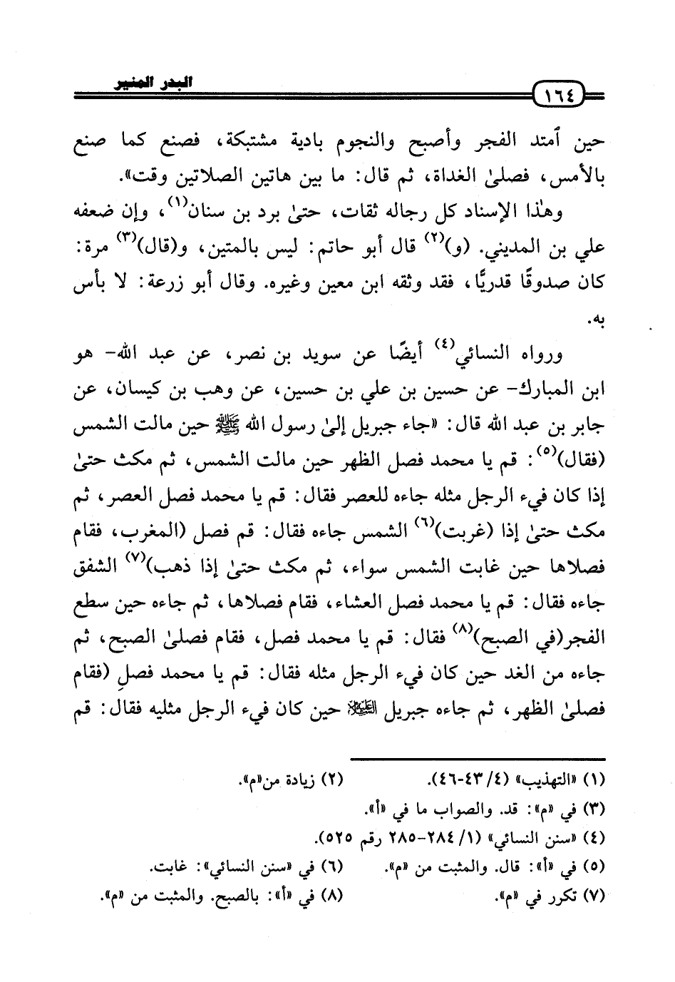 وَرَوَاهُ النَّسَائِيّ أَيْضا عَن سُوَيْد بن نصر، عَن عبد الله - هُوَ ابْن الْمُبَارك - عَن حُسَيْن بن عَلّي بن حُسَيْن، عَن وهب بن كيسَان، عَن جَابر بن عبد الله قَالَ: «جَاءَ جِبْرِيل إِلَى رَسُول الله - صَلَّى الله عَلَيْهِ وَسلم - حِين مَالَتْ الشَّمْس (فَقَالَ) : قُم يَا مُحَمَّد فصل الظّهْر حِين مَالَتْ الشَّمْس، ثمَّ مكث حَتَّى إِذا كَانَ فَيْء الرجل مثله جَاءَهُ للعصر فَقَالَ: قُم يَا مُحَمَّد فصل الْعَصْر، ثمَّ مكث حَتَّى إِذا (غربت) الشَّمْس جَاءَهُ فَقَالَ: قُم فصل (الْمغرب، فَقَامَ فَصلاهَا حِين غَابَتْ الشَّمْس سَوَاء، ثمَّ مكث حَتَّى إِذا ذهب) الشَّفق جَاءَهُ فَقَالَ: قُم يَا مُحَمَّد فصل الْعشَاء، فَقَامَ فَصلاهَا، ثمَّ جَاءَهُ حِين سَطَعَ الْفجْر (فِي الصُّبْح) فَقَالَ: قُم يَا مُحَمَّد فصل، فَقَامَ فَصَلى الصُّبْح، ثمَّ جَاءَهُ من الْغَد حِين كَانَ فَيْء الرجل مثله فَقَالَ: قُم يَا مُحَمَّد فصلِ (فَقَامَ فَصَلى الظّهْر، ثمَّ جَاءَهُ جِبْرِيل عَلَيْهِ السَّلَام حِين كَانَ فَيْء الرجل مثلَيْهِ فَقَالَ: قُم