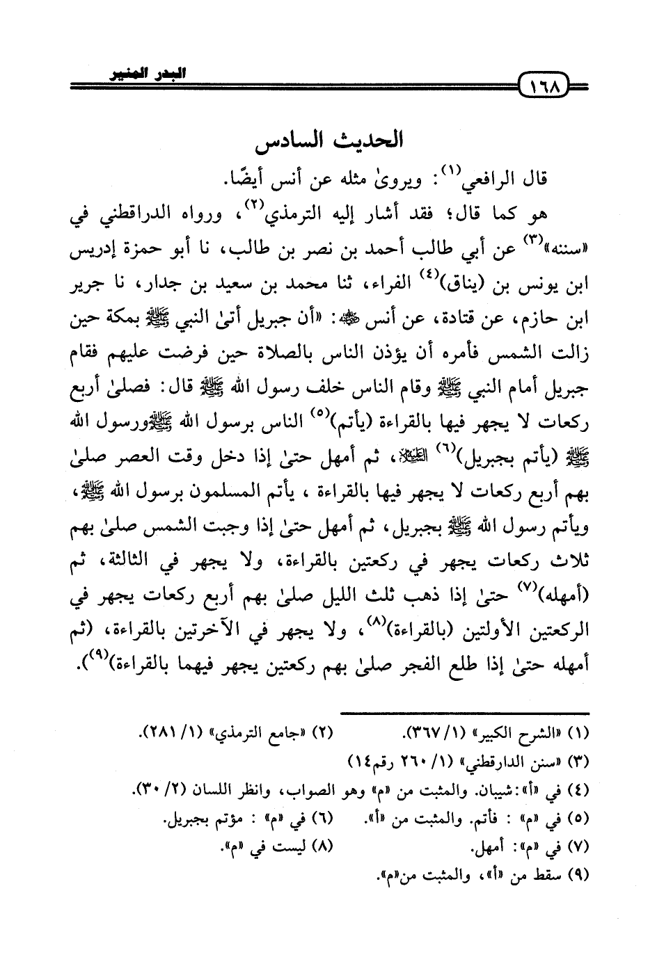 هُوَ كَمَا قَالَ؛ فقد أَشَارَ إِلَيْهِ التِّرْمِذِيّ، وَرَوَاهُ الدارقطني فِي «سنَنه» عَن أبي طَالب أَحْمد بن نصر بن طَالب، نَا أَبُو حَمْزَة إِدْرِيس بن يُونُس بن (يناق) الْفراء، ثَنَا مُحَمَّد بن سعيد بن جِدَار، نَا جرير بن حَازِم، عَن قَتَادَة، عَن أنس رَضِيَ اللَّهُ عَنْه: «أَن جِبْرِيل أَتَى النَّبِي - صَلَّى الله عَلَيْهِ وَسلم - بِمَكَّة حِين زَالَت الشَّمْس فَأمره أَن يُؤذن النَّاس بِالصَّلَاةِ حِين فرضت عَلَيْهِم فَقَامَ جِبْرِيل أَمَام النَّبِي - صَلَّى الله عَلَيْهِ وَسلم - وَقَامَ النَّاس خلف رَسُول الله - صَلَّى الله عَلَيْهِ وَسلم - قَالَ: فَصَلى أَربع رَكْعَات لَا يجْهر فِيهَا بِالْقِرَاءَةِ (يأتم) النَّاس برَسُول الله - صَلَّى الله عَلَيْهِ وَسلم - وَرَسُول الله - صَلَّى الله عَلَيْهِ وَسلم - (يأتم بِجِبْرِيل) عَلَيْهِ السَّلَام، ثمَّ أمْهل حَتَّى إِذا دخل وَقت الْعَصْر صَلَّى بهم أَربع رَكْعَات لَا يجْهر فِيهَا بِالْقِرَاءَةِ، يأتم الْمُسلمُونَ برَسُول الله - صَلَّى الله عَلَيْهِ وَسلم -، ويأتم رَسُول الله - صَلَّى الله عَلَيْهِ وَسلم - بِجِبْرِيل، ثمَّ أمْهل حَتَّى إِذا وَجَبت الشَّمْس صَلَّى بهم ثَلَاث رَكْعَات يجْهر فِي رَكْعَتَيْنِ بِالْقِرَاءَةِ، وَلَا يجْهر فِي الثَّالِثَة، ثمَّ (أمهله) حَتَّى إِذا ذهب ثلث اللَّيْل صَلَّى بهم أَربع رَكْعَات يجْهر فِي الرَّكْعَتَيْنِ الأولتين (بِالْقِرَاءَةِ) ، وَلَا يجْهر فِي الآخرتين بِالْقِرَاءَةِ، (ثمَّ أمهله حَتَّى إِذا طلع الْفجْر صَلَّى بهم رَكْعَتَيْنِ يجْهر فيهمَا بِالْقِرَاءَةِ) » .
