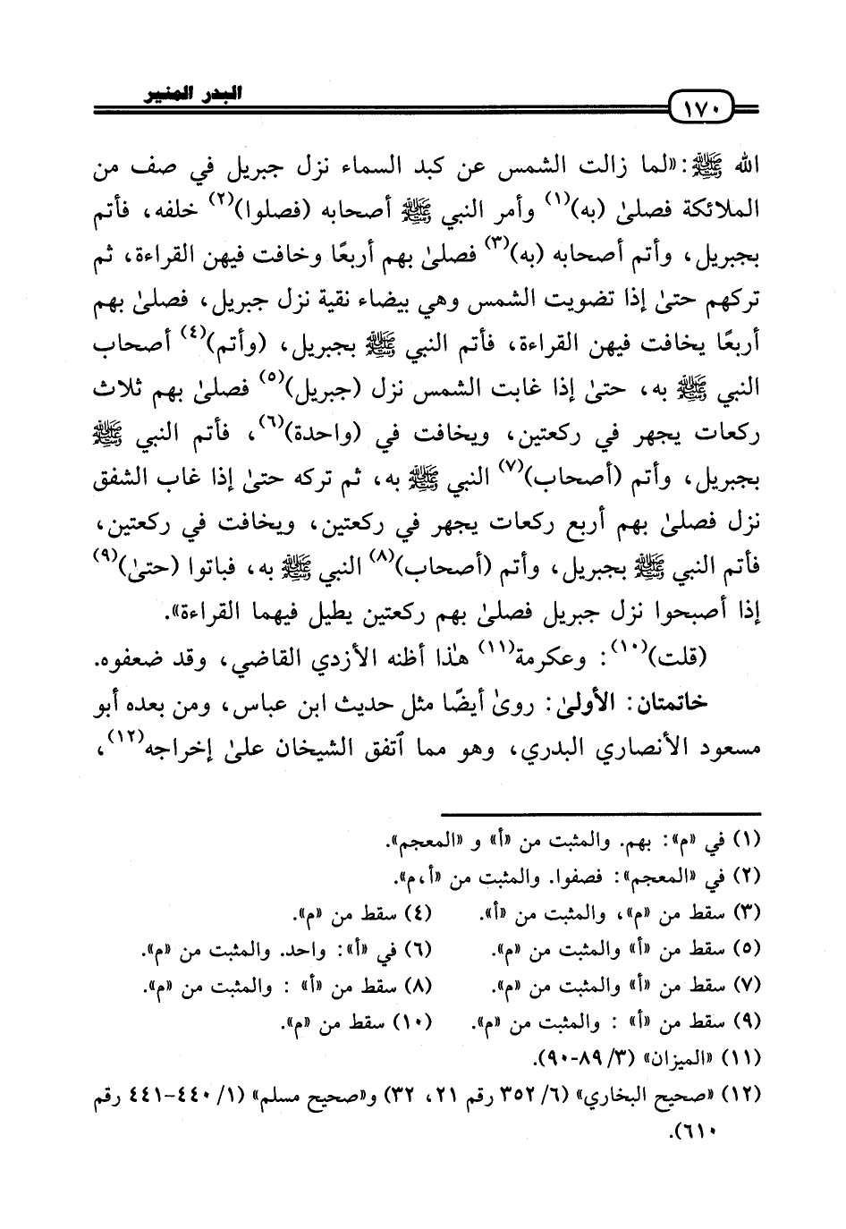 الله (: (لما زَالَت الشَّمْس عَن كبد السَّمَاء نزل جِبْرِيل فِي صف من الْمَلَائِكَة فَصَلى (بِهِ) وَأمر النَّبِي - صَلَّى الله عَلَيْهِ وَسلم - أَصْحَابه (فصلوا) خَلفه، فَأَتمَّ بِجِبْرِيل، وَأتم أَصْحَابه (بِهِ) فَصَلى بهم أَرْبعا وخافت فِيهِنَّ الْقِرَاءَة، ثمَّ تَركهم حَتَّى إِذا تضويت الشَّمْس وَهِي بَيْضَاء نقية نزل جِبْرِيل، فَصَلى بهم أَرْبعا يُخَافت فِيهِنَّ الْقِرَاءَة، فَأَتمَّ النَّبِي - صَلَّى الله عَلَيْهِ وَسلم - بِجِبْرِيل، (وَأتم) أَصْحَاب النَّبِي - صَلَّى الله عَلَيْهِ وَسلم - بِهِ، حَتَّى إِذا غَابَتْ الشَّمْس نزل (جِبْرِيل) فَصَلى بهم ثَلَاث رَكْعَات يجْهر فِي رَكْعَتَيْنِ، ويخافت فِي (وَاحِدَة) ، فَأَتمَّ النَّبِي - صَلَّى الله عَلَيْهِ وَسلم - بِجِبْرِيل، وَأتم (أَصْحَاب) النَّبِي - صَلَّى الله عَلَيْهِ وَسلم - بِهِ، ثمَّ تَركه حَتَّى إِذا غَابَ الشَّفق نزل فَصَلى بهم أَربع رَكْعَات يجْهر فِي رَكْعَتَيْنِ، ويخافت فِي رَكْعَتَيْنِ، فَأَتمَّ النَّبِي - صَلَّى الله عَلَيْهِ وَسلم - بِجِبْرِيل، وَأتم (أَصْحَاب) النَّبِي - صَلَّى الله عَلَيْهِ وَسلم - بِهِ، فَبَاتُوا (حَتَّى) إِذا أَصْبحُوا نزل جِبْرِيل فَصَلى بهم رَكْعَتَيْنِ يُطِيل فيهمَا الْقِرَاءَة) .
