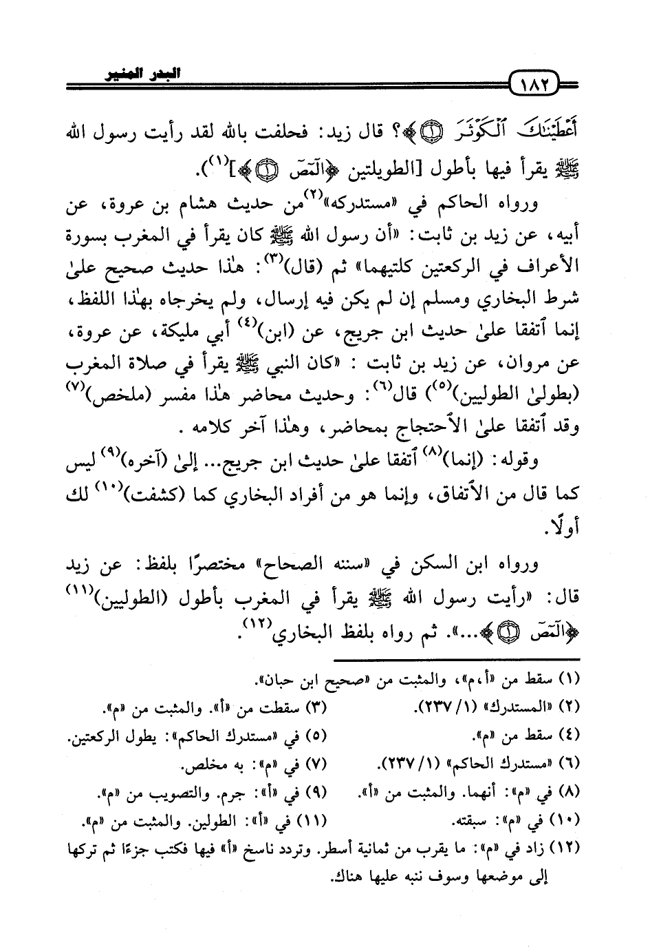 اعطيناك الْكَوْثَر (؟ قَالَ زيد: فَحَلَفت بِاللَّه لقد رَأَيْت رَسُول الله - صَلَّى الله عَلَيْهِ وَسلم - يقْرَأ فِيهَا بأطول [الطويلتين (المص (] » .