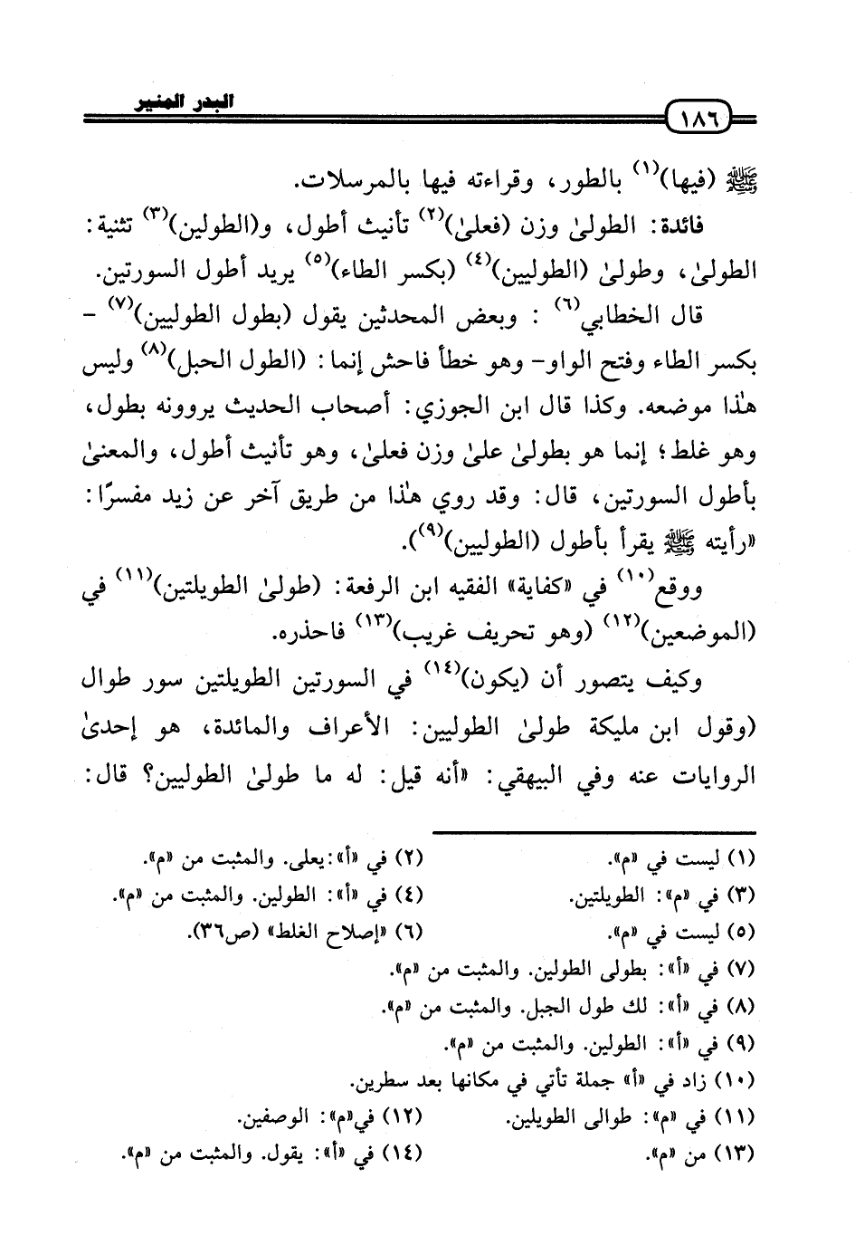 قَالَ الْخطابِيّ: وَبَعض الْمُحدثين يَقُول (بطول الطوليين) - بِكَسْر الطَّاء وَفتح الْوَاو - وَهُوَ خطأ فَاحش إِنَّمَا: (الطول الْحَبل) وَلَيْسَ هَذَا مَوْضِعه. وَكَذَا قَالَ ابْن الْجَوْزِيّ: أَصْحَاب الحَدِيث يَرْوُونَهُ بطول، وَهُوَ غلط؛ إِنَّمَا هُوَ بطولى عَلَى وزن فعلَى، وَهُوَ تَأْنِيث أطول، وَالْمعْنَى بأطول السورتين، قَالَ: وَقد رُوِيَ هَذَا من طَرِيق آخر عَن زيد مُفَسرًا: «رَأَيْته (يقْرَأ بأطول (الطوليين) » .