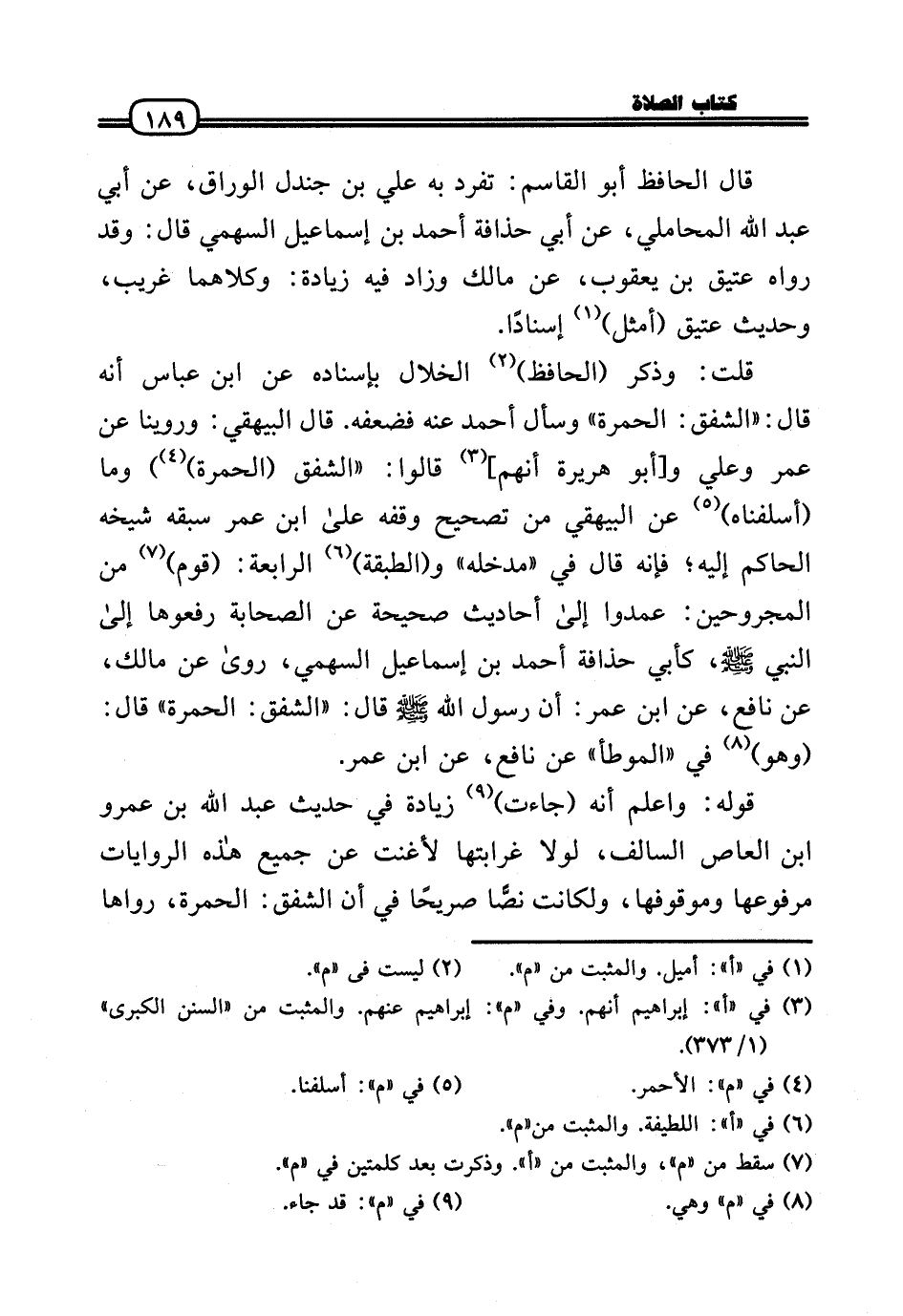 قلت: وَذكر (الْحَافِظ) الْخلال بِإِسْنَادِهِ عَن ابْن عَبَّاس أَنه قَالَ: (الشَّفق: الْحمرَة) وَسَأَلَ أَحْمد عَنهُ فضعفه. قَالَ الْبَيْهَقِيّ: وروينا عَن عمر وَعلي و [أَبُو هُرَيْرَة أَنهم] قَالُوا: «الشَّفق (الْحمرَة) » وَمَا (أسلفناه) عَن الْبَيْهَقِيّ من تَصْحِيح وَقفه عَلَى ابْن عمر سبقه شَيْخه الْحَاكِم إِلَيْهِ؛ فَإِنَّهُ قَالَ فِي «مدخله» و (الطَّبَقَة) الرَّابِعَة: (قوم) من الْمَجْرُوحين: عَمدُوا إِلَى أَحَادِيث صَحِيحَة عَن الصَّحَابَة رفعوها إِلَى النَّبِي - صَلَّى الله عَلَيْهِ وَسلم -، كَأبي حذافة أَحْمد بن إِسْمَاعِيل السَّهْمِي، رَوَى عَن مَالك، عَن نَافِع، عَن ابْن عمر: أَن رَسُول الله - صَلَّى الله عَلَيْهِ وَسلم - قَالَ: (الشَّفق: الْحمرَة) قَالَ: (وَهُوَ) فِي «الْمُوَطَّأ» عَن نَافِع، عَن ابْن عمر.
