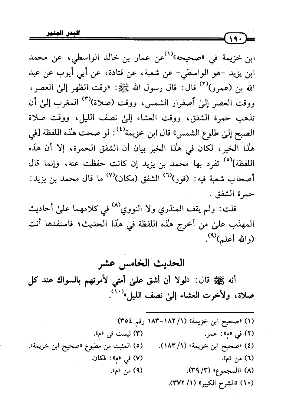 ابْن خُزَيْمَة فِي «صَحِيحه» عَن عمار بن خَالِد الوَاسِطِيّ، عَن مُحَمَّد بن يزِيد - هُوَ الوَاسِطِيّ - عَن شُعْبَة، عَن قَتَادَة، عَن أبي أَيُّوب عَن عبد الله بن (عَمْرو) قَالَ: قَالَ رَسُول الله - صَلَّى الله عَلَيْهِ وَسلم -: «وَقت الظّهْر إِلَى الْعَصْر، وَوقت الْعَصْر إِلَى اصفرار الشَّمْس، وَوقت (صَلَاة) الْمغرب إِلَى أَن تذْهب حمرَة الشَّفق، وَوقت الْعشَاء إِلَى نصف اللَّيْل، وَوقت صَلَاة الصُّبْح إِلَى طُلُوع الشَّمْس» قَالَ ابْن خُزَيْمَة: لَو صحت هَذِه اللَّفْظَة [فِي هَذَا الْخَبَر، لَكَانَ فِي هَذَا الْخَبَر بَيَان أَن الشَّفق الْحمرَة، إِلَّا أَن هَذِه اللَّفْظَة] تفرد بهَا مُحَمَّد بن يزِيد إِن كَانَت حفظت عَنهُ، وَإِنَّمَا قَالَ أَصْحَاب شُعْبَة فِيهِ: (فَور) الشَّفق (مَكَان) مَا قَالَ مُحَمَّد بن يزِيد: حمرَة الشَّفق.