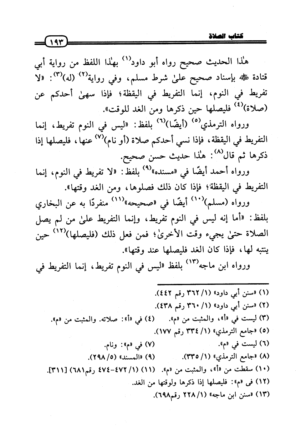 هَذَا الحَدِيث صَحِيح رَوَاهُ أَبُو دَاوُد بِهَذَا اللَّفْظ من رِوَايَة أبي قَتَادَة رَضِيَ اللَّهُ عَنْه بِإِسْنَاد صَحِيح عَلَى شَرط مُسلم، وَفِي رِوَايَة (لَهُ) : «لَا تَفْرِيط فِي النّوم، إِنَّمَا التَّفْرِيط فِي الْيَقَظَة؛ فَإِذا سهى أحدكُم عَن (صَلَاة) فليصلها حِين ذكرهَا وَمن الْغَد للْوَقْت» .