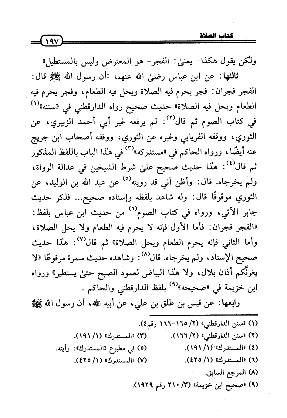ثَالِثهَا: عَن ابْن عَبَّاس رضى الله عَنْهُمَا (أَن رَسُول الله - صَلَّى الله عَلَيْهِ وَسلم - قَالَ: الْفجْر فجران: فجر يحرم فِيهِ الصَّلَاة وَيحل فِيهِ الطَّعَام، وفجر يحرم فِيهِ الطَّعَام وَيحل فِيهِ الصَّلَاة) حَدِيث صَحِيح رَوَاهُ الدَّارَقُطْنِيّ فِي «سنَنه» فِي كتاب الصَّوْم ثمَّ قَالَ: لم يرفعهُ غير أبي أَحْمد الزبيري، عَن الثَّوْريّ، وَوَقفه الْفرْيَابِيّ وَغَيره عَن الثَّوْريّ، وَوَقفه أَصْحَاب ابْن جريج عَنهُ أَيْضا، وَرَوَاهُ الْحَاكِم فِي «مُسْتَدْركه» فِي هَذَا الْبَاب بِاللَّفْظِ الْمَذْكُور ثمَّ قَالَ: هَذَا حَدِيث صَحِيح عَلَى شَرط الشَّيْخَيْنِ فِي عَدَالَة الروَاة، وَلم يخرجَاهُ. قَالَ: وأظن أَنِّي قد رويته عَن عبد الله بن الْوَلِيد، عَن الثَّوْريّ مَوْقُوفا قَالَ: وَله شَاهد بِلَفْظِهِ وَإِسْنَاده صَحِيح ... فَذكر حَدِيث جَابر الْآتِي، وَرَوَاهُ فِي كتاب الصَّوْم من حَدِيث ابْن عَبَّاس بِلَفْظ: (الْفجْر فجران: فَأَما الأول فَإِنَّهُ لَا يحرم فِيهِ الطَّعَام وَلَا يحل الصَّلَاة، وَأما الثَّانِي فَإِنَّهُ يحرم الطَّعَام وَيحل الصَّلَاة) ثمَّ قَالَ: هَذَا حَدِيث صَحِيح الْإِسْنَاد، وَلم يخرجَاهُ. قَالَ: وَشَاهده حَدِيث سَمُرَة مَرْفُوعا «لَا يغرنَّكم أَذَان بِلَال، وَلَا هَذَا الْبيَاض لعمود الصُّبْح حَتَّى يستطير) وَرَوَاهُ ابْن خُزَيْمَة فِي «صَحِيحه» بِلَفْظ الدَّارَقُطْنِيّ وَالْحَاكِم.
