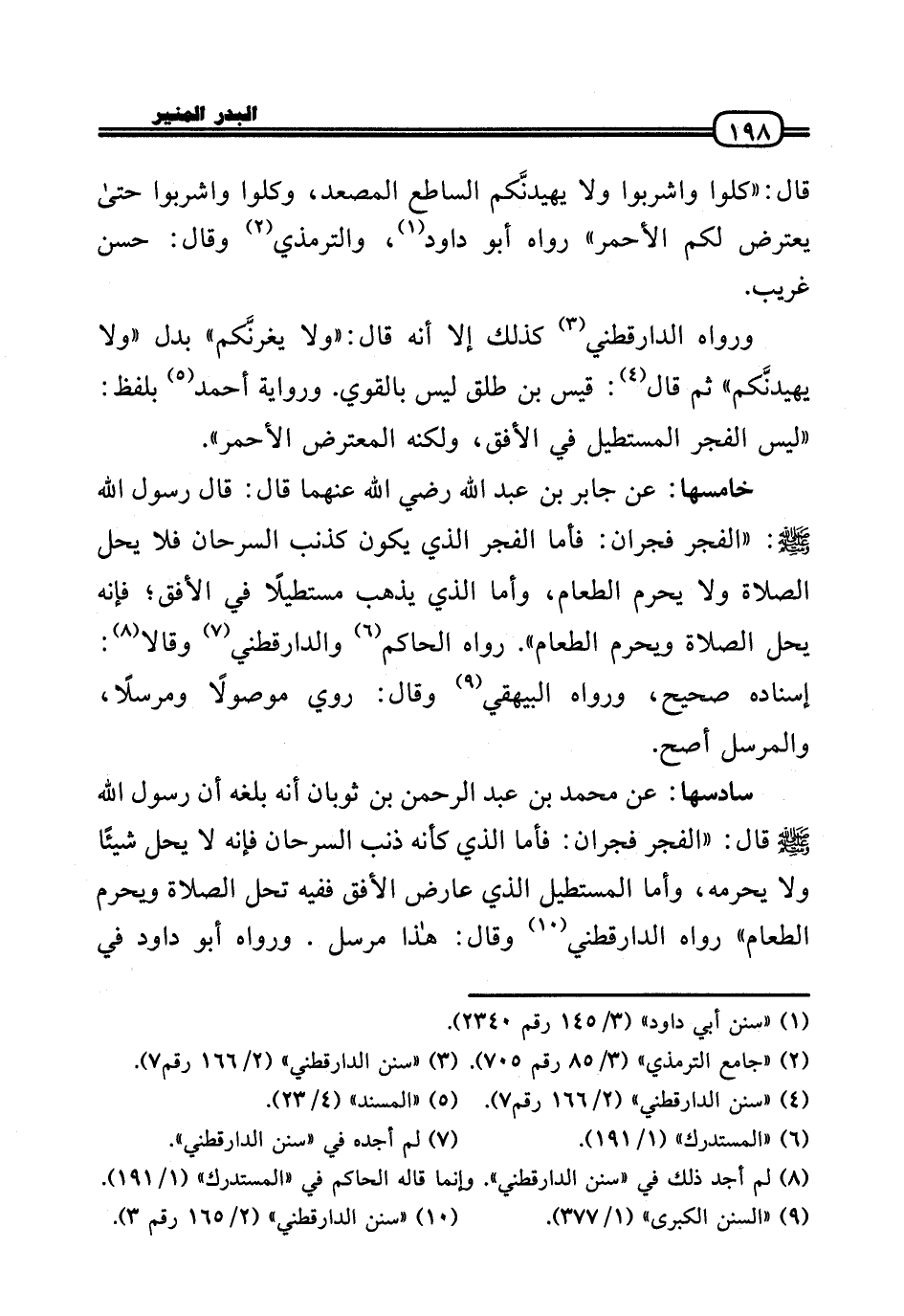 خَامِسهَا: عَن جَابر بن عبد الله رَضِيَ اللَّهُ عَنْهما قَالَ: قَالَ رَسُول الله - صَلَّى الله عَلَيْهِ وَسلم -: (الْفجْر فجران: فَأَما الْفجْر الَّذِي يكون كذنب السرحان فَلَا يحل الصَّلَاة وَلَا يحرم الطَّعَام، وَأما الَّذِي يذهب مستطيلًا فِي الْأُفق؛ فَإِنَّهُ يحل الصَّلَاة وَيحرم الطَّعَام) . رَوَاهُ الْحَاكِم وَالدَّارَقُطْنِيّ وَقَالا: إِسْنَاده صَحِيح، وَرَوَاهُ الْبَيْهَقِيّ وَقَالَ: رُوِيَ مَوْصُولا ومرسلًا، والمرسل أصح.