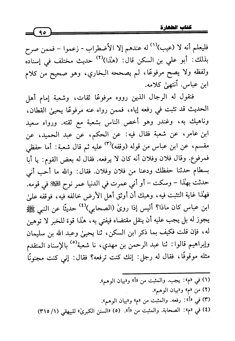 فَنَقُول لَهُ الرِّجَال الَّذين رَوَوْهُ مَرْفُوعا ثِقَات، وَشعْبَة إِمَام أهل الحَدِيث قد تثبت فِي رَفعه إِيَّاه، فَمِمَّنْ رَوَاهُ عَنهُ مَرْفُوعا يَحْيَى الْقطَّان، وناهيك بِهِ، وغندر وَهُوَ أخص النَّاس بشعبة مَعَ ثقته. وَرَوَاهُ سعيد بن عَامر، عَن شُعْبَة فَقَالَ فِيهِ: عَن الحكم، عَن عبد الحميد، عَن مقسم، عَن ابْن عَبَّاس من قَوْله (وَقفه) عَلَيْهِ ثمَّ قَالَ شُعْبَة: أما حفظي فمرفوع. وَقَالَ فلَان وَفُلَان أَنه كَانَ لَا يرفعهُ. فَقَالَ لَهُ بعض الْقَوْم: يَا أَبَا بسطَام حَدثنَا حفظك وَدعنَا من فلَان وَفُلَان. فَقَالَ: وَالله مَا أحب أَنِّي حدثت بِهَذَا - وَسكت - أَو أَنِّي عمرت فِي الدُّنْيَا عمر نوح عَلَيْهِ السَّلَام فِي قومه. فَهَذَا غَايَة التثبت فِيهِ، وهبك أَن أوثق أهل الأَرْض خَالفه فِيهِ، فَوَقفهُ عَلَى ابْن عَبَّاس كَانَ مَاذَا؟ أَلَيْسَ إِذا رَوَى (الصَّحَابِيّ) حَدِيثا عَن النَّبِي صَلَّى اللَّهُ عَلَيْهِ وَسَلَّم َ يجوز لَهُ بل يجب عَلَيْهِ أَن ينْقل مُقْتَضَاهُ فيفتي بِهِ، هَذَا قُوَّة للْخَبَر لَا توهين لَهُ، فَإِن قلت فَكيف بِمَا ذكر ابْن السكن، ثَنَا يَحْيَى وَعبد الله بن سُلَيْمَان وَإِبْرَاهِيم قَالُوا: ثَنَا عبد الرَّحْمَن بن مهْدي، نَا شُعْبَة بِالْإِسْنَادِ الْمُتَقَدّم مثله مَوْقُوفا، فَقَالَ لَهُ رجل: إِنَّك كنت ترفعه؟ فَقَالَ: إِنِّي كنت مَجْنُونا