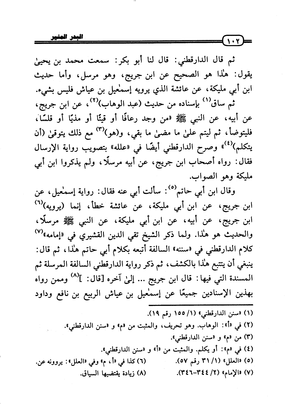 ثمَّ سَاق بِإِسْنَادِهِ من حَدِيث (عبد الْوَهَّاب) ، عَن ابْن جريج، عَن أَبِيه، عَن النَّبِي - صَلَّى الله عَلَيْهِ وَسلم - «من وجد رعافًا أَو قيئًا أَو مذيًا أَو قلسًا، فَليَتَوَضَّأ، ثمَّ ليتم عَلَى مَا مَضَى مَا بَقِي، و (هُوَ) مَعَ ذَلِك يتوقى (أَن يتَكَلَّم) » وَصرح الدَّارَقُطْنِيّ أَيْضا فِي «علله» بتصويب رِوَايَة الْإِرْسَال فَقَالَ: رَوَاهُ أَصْحَاب ابْن جريج، عَن أَبِيه مُرْسلا، وَلم يذكرُوا ابْن أبي مليكَة وَهُوَ الصَّوَاب.