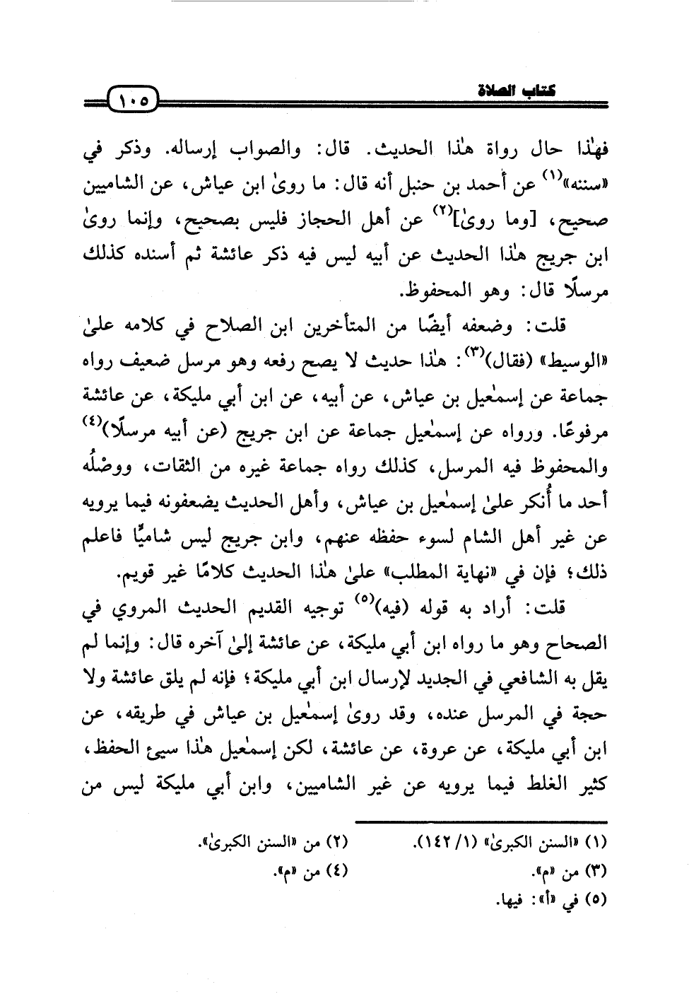 قلت: وَضَعفه أَيْضا من الْمُتَأَخِّرين ابْن الصّلاح فِي كَلَامه عَلَى «الْوَسِيط» (فَقَالَ) : هَذَا حَدِيث لَا يَصح رَفعه وَهُوَ مُرْسل ضَعِيف رَوَاهُ جمَاعَة عَن إِسْمَاعِيل بن عَيَّاش، عَن أَبِيه، عَن ابْن أبي مليكَة، عَن عَائِشَة مَرْفُوعا. وَرَوَاهُ عَن إِسْمَاعِيل جمَاعَة عَن ابْن جريج (عَن أَبِيه مُرْسلا) وَالْمَحْفُوظ فِيهِ الْمُرْسل، كَذَلِك رَوَاهُ جمَاعَة غَيره من الثِّقَات، ووصْلُِه أحد مَا أُنكر عَلَى إِسْمَاعِيل بن عَيَّاش، وَأهل الحَدِيث يضعفونه فِيمَا يرويهِ عَن غير أهل الشَّام لسوء حفظه عَنْهُم، وَابْن جريج لَيْسَ شاميٍّا فَاعْلَم ذَلِك؛ فَإِن فِي «نِهَايَة الْمطلب» عَلَى هَذَا الحَدِيث كلَاما غير قويم.