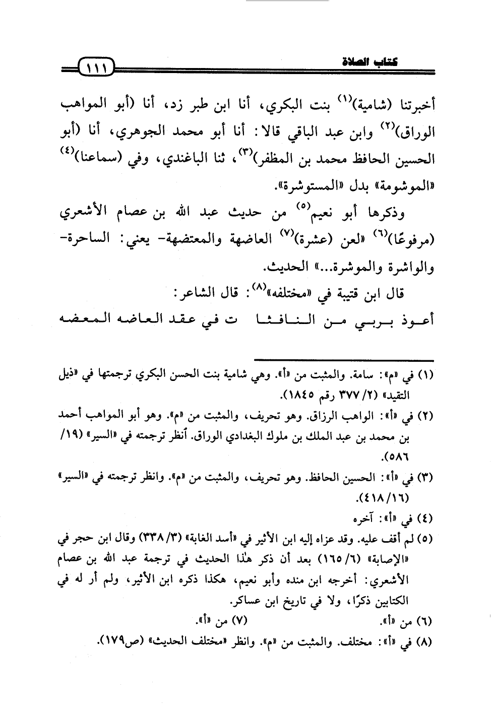 أخبرتنا (شامية) بنت الْبكْرِيّ، أَنا ابْن طبر زد، أَنا (أَبُو الْمَوَاهِب الْوراق) وَابْن عبد الْبَاقِي قَالَا: أَنا أَبُو مُحَمَّد الْجَوْهَرِي، أَنا (أَبُو الْحُسَيْن الْحَافِظ مُحَمَّد بن المظفر) ، ثَنَا الباغندي، وَفِي (سَمَاعنَا) «الموشومة» بدل «المستوشرة» .