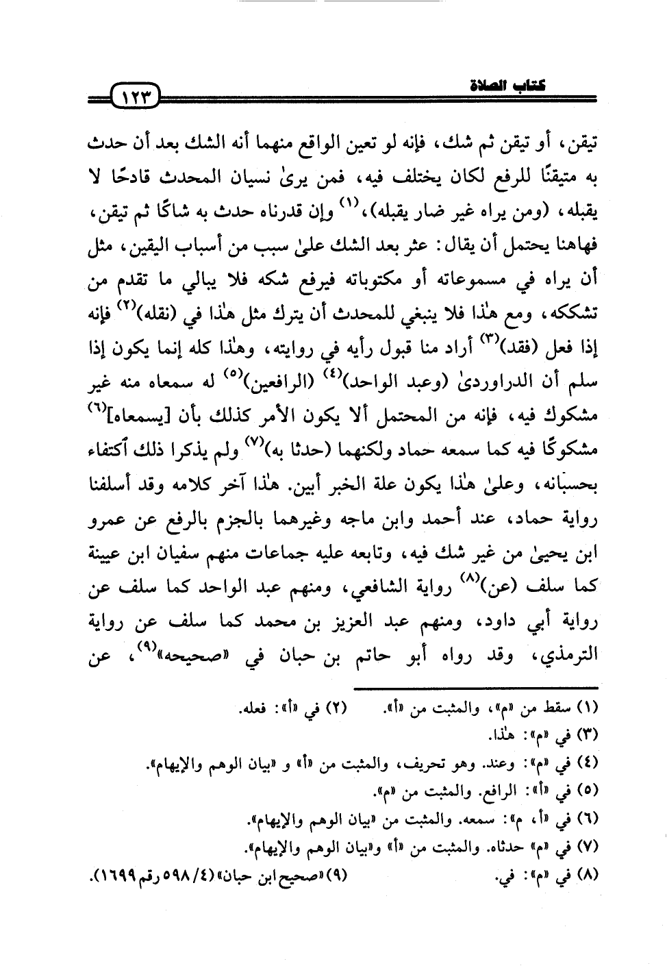 تَيَقّن، أَو تَيَقّن ثمَّ شكّ، فَإِنَّهُ لَو تعين الْوَاقِع مِنْهُمَا أَنه الشَّك بعد أَن حدث بِهِ متيقنًا للرفع لَكَانَ يخْتَلف فِيهِ، فَمن يرَى نِسْيَان الْمُحدث قادحًا لَا يقبله، (وَمن يرَاهُ غير ضار يقبله) ، وَإِن قدرناه حدث بِهِ شاكًا ثمَّ تَيَقّن، فهاهنا يحْتَمل أَن يُقَال: عثر بعد الشَّك عَلَى سَبَب من أَسبَاب الْيَقِين، مثل أَن يرَاهُ فِي مسموعاته أَو مكتوباته فيرفع شكه فَلَا يُبَالِي مَا تقدم من تشككه، وَمَعَ هَذَا فَلَا يَنْبَغِي للمحدث أَن يتْرك مثل هَذَا فِي (نَقله) فَإِنَّهُ إِذا فعل (فقد) أَرَادَ منا قبُول رَأْيه فِي رِوَايَته، وَهَذَا كُله إِنَّمَا يكون إِذا سلم أَن الدراوردى (وَعبد الْوَاحِد) (الرافعين) لَهُ سمعاه مِنْهُ غير مَشْكُوك فِيهِ، فَإِنَّهُ من الْمُحْتَمل أَلا يكون الْأَمر كَذَلِك بِأَن [يسمعاه] مشكوكًا فِيهِ كَمَا سَمعه حَمَّاد ولكنهما (حَدثا بِهِ) وَلم يذكرَا ذَلِك اكْتِفَاء بحسبانه، وَعَلَى هَذَا يكون عِلّة الْخَبَر أبين. هَذَا آخر كَلَامه وَقد أسلفنا رِوَايَة حَمَّاد، عِنْد أَحْمد وَابْن مَاجَه وَغَيرهمَا بِالْجَزْمِ بِالرَّفْع عَن عَمْرو بن يَحْيَى من غير شكّ فِيهِ، وَتَابعه عَلَيْهِ جماعات مِنْهُم سُفْيَان بن عُيَيْنَة كَمَا سلف (عَن) رِوَايَة الشَّافِعِي، وَمِنْهُم عبد الْوَاحِد كَمَا سلف عَن رِوَايَة أبي دَاوُد، وَمِنْهُم عبد الْعَزِيز بن مُحَمَّد كَمَا سلف عَن رِوَايَة التِّرْمِذِيّ، وَقد رَوَاهُ أَبُو حَاتِم بن حبَان فِي «صَحِيحه» ، عَن