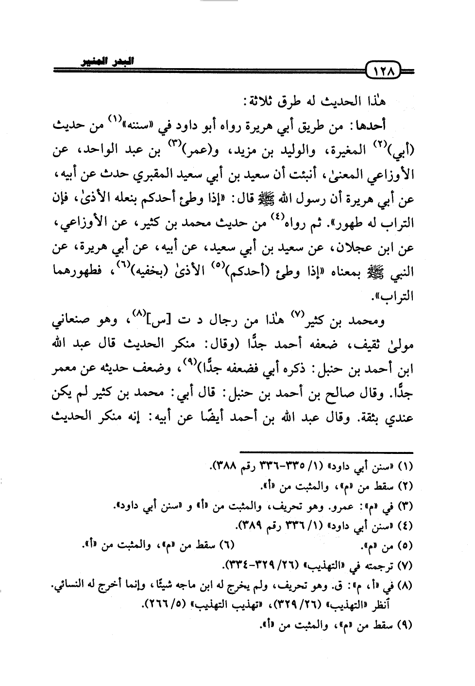 أَحدهَا: من طَرِيق أبي هُرَيْرَة رَوَاهُ أَبُو دَاوُد فِي «سنَنه» من حَدِيث (أبي) الْمُغيرَة، والوليد بن مزِيد، و (عمر) بن عبد الْوَاحِد، عَن الْأَوْزَاعِيّ الْمَعْنى، أنبئت أَن سعيد بن أبي سعيد المَقْبُري حدث عَن أَبِيه، عَن أبي هُرَيْرَة أَن رَسُول الله - صَلَّى الله عَلَيْهِ وَسلم - قَالَ: «إِذا وطئ أحدكُم بنعله الْأَذَى، فَإِن التُّرَاب لَهُ طهُور» . ثمَّ رَوَاهُ من حَدِيث مُحَمَّد بن كثير، عَن الْأَوْزَاعِيّ، عَن ابْن عجلَان، عَن سعيد بن أبي سعيد، عَن أَبِيه، عَن أبي هُرَيْرَة، عَن النَّبِي - صَلَّى الله عَلَيْهِ وَسلم - بِمَعْنَاهُ «إِذا وطئ (أحدكُم) الْأَذَى (بخفيه) ، فطهورهما التُّرَاب» .