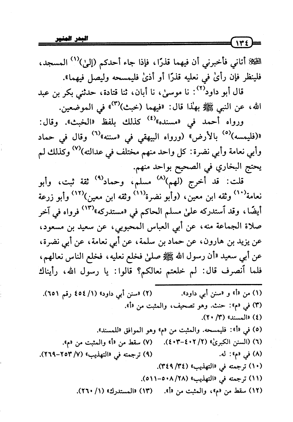 وَرَوَاهُ أَحْمد فِي «مُسْنده» كَذَلِك بِلَفْظ «الْخبث» . وَقَالَ: «فليمسه) بِالْأَرْضِ» (وَرَوَاهُ الْبَيْهَقِيّ فِي «سنَنه» وَقَالَ فِي حَمَّاد وَأبي نعَامَة وَأبي نَضرة: كل وَاحِد مِنْهُم مُخْتَلف فِي عَدَالَته) وَكَذَلِكَ لم يحْتَج البُخَارِيّ فِي الصَّحِيح بِوَاحِد مِنْهُم.