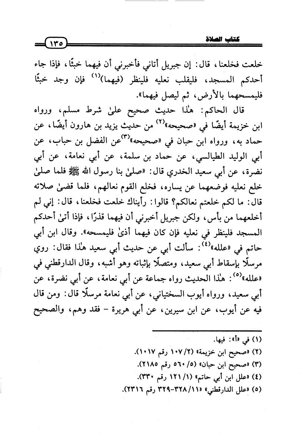 قَالَ الْحَاكِم: هَذَا حَدِيث صَحِيح عَلَى شَرط مُسلم، وَرَوَاهُ ابْن خُزَيْمَة أَيْضا فِي «صَحِيحه» من حَدِيث يزِيد بن هَارُون أَيْضا، عَن حَمَّاد بِهِ، وَرَوَاهُ ابْن حبَان فِي «صَحِيحه» عَن الْفضل بن حباب، عَن أبي الْوَلِيد الطَّيَالِسِيّ، عَن حَمَّاد بن سَلمَة، عَن أبي نعَامَة، عَن أبي نَضرة، عَن أبي سعيد الْخُدْرِيّ قَالَ: «صَلَّى بِنَا رَسُول الله - صَلَّى الله عَلَيْهِ وَسلم - فَلَمَّا صَلَّى خلع نَعْلَيْه فوضعهما عَن يسَاره، فَخلع الْقَوْم نعَالهمْ، فَلَمَّا قَضَى صلَاته قَالَ: مَا لكم خلعتم نعالكم؟ قَالُوا: رَأَيْنَاك خلعت فخلعنا، قَالَ: إِنِّي لم أخلعهما من بَأْس، وَلَكِن جِبْرِيل أَخْبرنِي أَن فيهمَا قذرًا، فَإِذا أَتَى أحدكُم الْمَسْجِد فَلْينْظر فِي نَعْلَيْه فَإِن كَانَ فيهمَا أَذَى فليمسحه» . وَقَالَ ابْن أبي حَاتِم فِي «علله» : سَأَلت أبي عَن حَدِيث أبي سعيد هَذَا فَقَالَ: رُوِيَ مُرْسلا بِإِسْقَاط أبي سعيد، ومتصلًا بإثباته وَهُوَ أشبه، وَقَالَ الدَّارَقُطْنِيّ فِي «علله» : هَذَا الحَدِيث رَوَاهُ جمَاعَة عَن أبي نعَامَة، عَن أبي نَضرة، عَن أبي سعيد، وَرَوَاهُ أَيُّوب السّخْتِيَانِيّ، عَن أبي نعَامَة مُرْسلا قَالَ: وَمن قَالَ فِيهِ