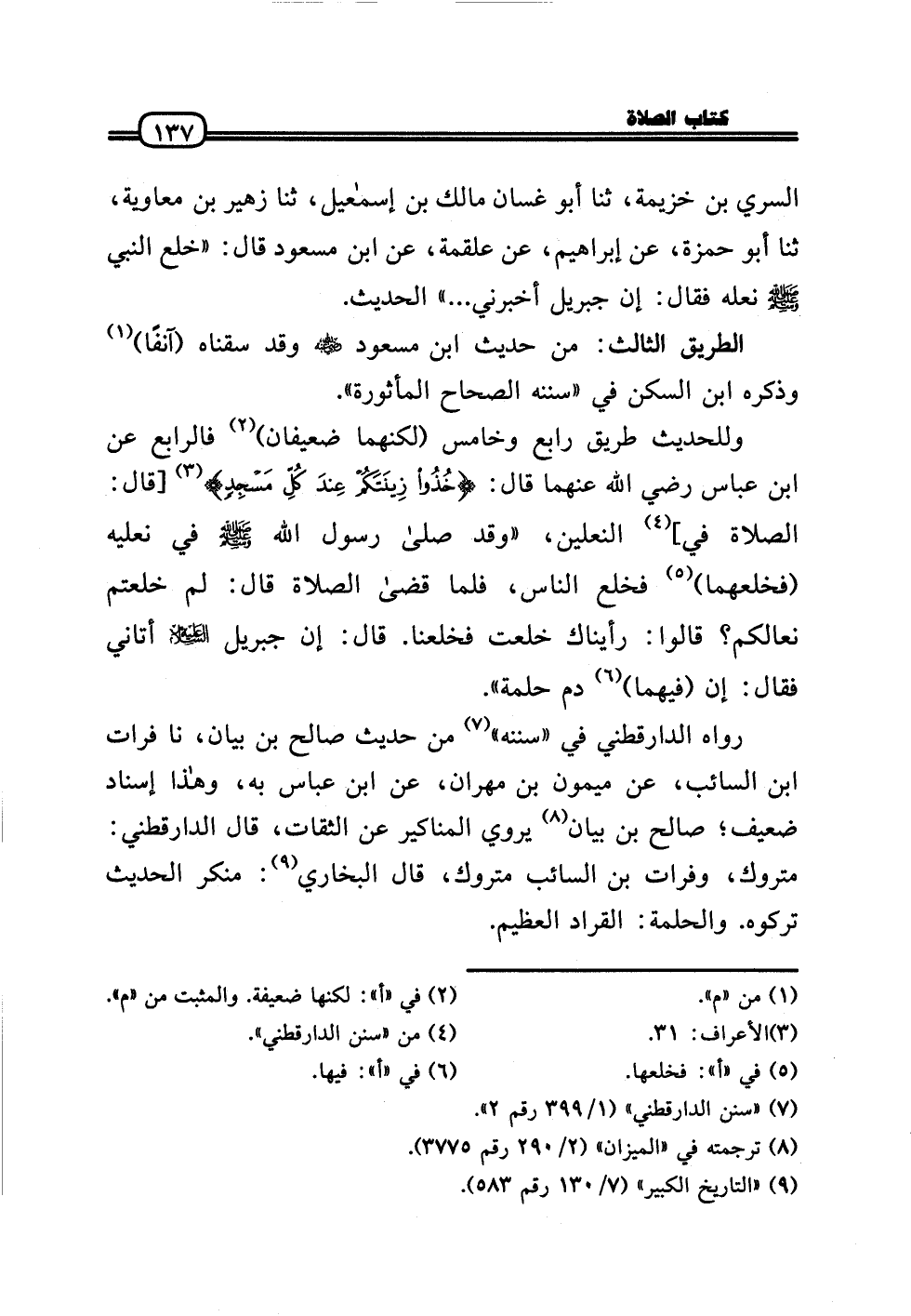 وَلِلْحَدِيثِ طَرِيق رَابِع وخامس (لكنهما ضعيفان) فالرابع عَن ابْن عَبَّاس رَضِيَ اللَّهُ عَنْهما قَالَ: (خُذُوا زينتكم عِنْد كل مَسْجِد) [قَالَ: الصَّلَاة فِي] النَّعْلَيْنِ، (وَقد صَلَّى رَسُول الله - صَلَّى الله عَلَيْهِ وَسلم - فِي نَعْلَيْه (فخلعهما) فَخلع النَّاس، فَلَمَّا قَضَى الصَّلَاة قَالَ: لم خلعتم نعالكم؟ قَالُوا: رَأَيْنَاك خلعت فخلعنا. قَالَ: إِن جِبْرِيل عَلَيْهِ السَّلَام أَتَانِي فَقَالَ: إِن (فيهمَا) دم حلمة» .