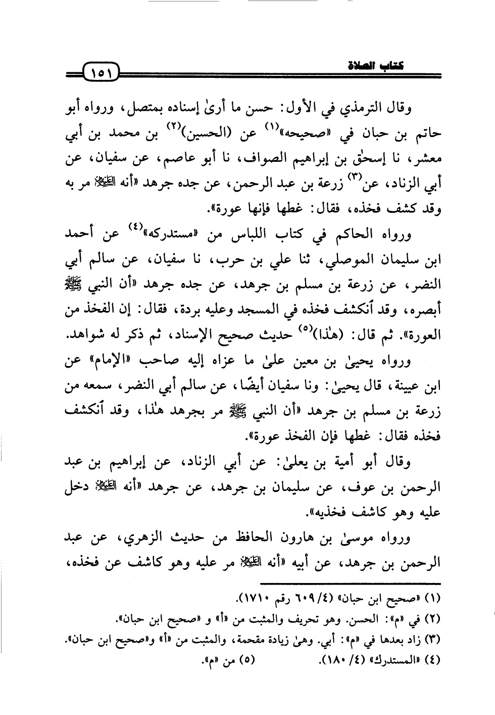 وَقَالَ التِّرْمِذِيّ فِي الأول: حسن مَا أرَى إِسْنَاده بِمُتَّصِل، وَرَوَاهُ أَبُو حَاتِم بن حبَان فِي «صَحِيحه» عَن (الْحُسَيْن) بن مُحَمَّد بن أبي معشر، نَا إِسْحَاق بن إِبْرَاهِيم الصَّواف، نَا أَبُو عَاصِم، عَن سُفْيَان، عَن أبي الزِّنَاد، عَن زرْعَة بن عبد الرَّحْمَن، عَن جده جرهد «أَنه عَلَيْهِ السَّلَام مر بِهِ وَقد كشف فَخذه، فَقَالَ: غطها فَإِنَّهَا عَورَة» .