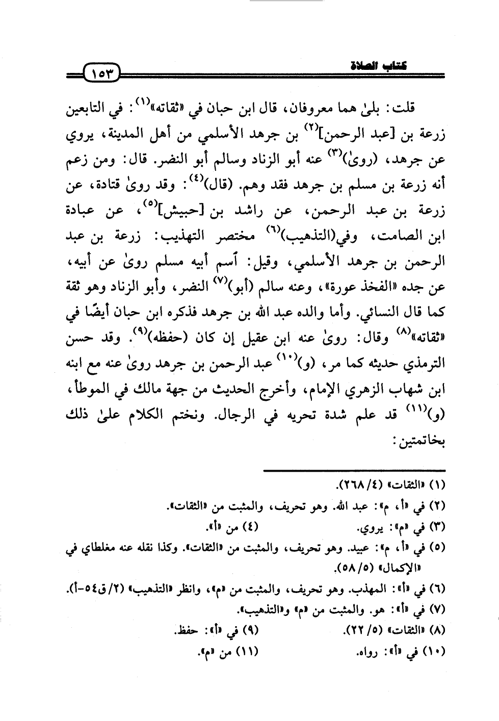 قلت: بلَى هما معروفان، قَالَ ابْن حبَان فِي «ثقاته» : فِي التَّابِعين زرْعَة بن [عبد الرَّحْمَن] بن جرهد الْأَسْلَمِيّ من أهل الْمَدِينَة، يروي عَن جرهد، (رَوَى) عَنهُ أَبُو الزِّنَاد وَسَالم أَبُو النَّضر. قَالَ: وَمن زعم أَنه زرْعَة بن مُسلم بن جرهد فقد وهم. (قَالَ) : وَقد رَوَى قَتَادَة، عَن زرْعَة بن عبد الرَّحْمَن، عَن رَاشد بن [حُبَيْش] ، عَن عبَادَة بن الصَّامِت، وَفِي (التذهيب) مُخْتَصر التَّهْذِيب: زرْعَة بن عبد الرَّحْمَن بن جرهد الْأَسْلَمِيّ، وَقيل: اسْم أَبِيه مُسلم رَوَى عَن أَبِيه، عَن جده «الْفَخْذ عَورَة» ، وَعنهُ سَالم (أَبُو) النَّضر، وَأَبُو الزِّنَاد وَهُوَ ثِقَة كَمَا قَالَ النَّسَائِيّ. وَأما وَالِده عبد الله بن جرهد فَذكره ابْن حبَان أَيْضا فِي «ثقاته» وَقَالَ: رَوَى عَنهُ ابْن عقيل إِن كَانَ (حفظه) . وَقد حسن التِّرْمِذِيّ حَدِيثه كَمَا مر، (و) عبد الرَّحْمَن بن جرهد رَوَى عَنهُ مَعَ ابْنه ابْن شهَاب الزُّهْرِيّ الإِمَام، وَأخرج الحَدِيث من جِهَة مَالك فِي الْمُوَطَّأ، (و) قد علم شدَّة تحريه فِي الرِّجَال. ونختم الْكَلَام عَلَى ذَلِك بخاتمتين: