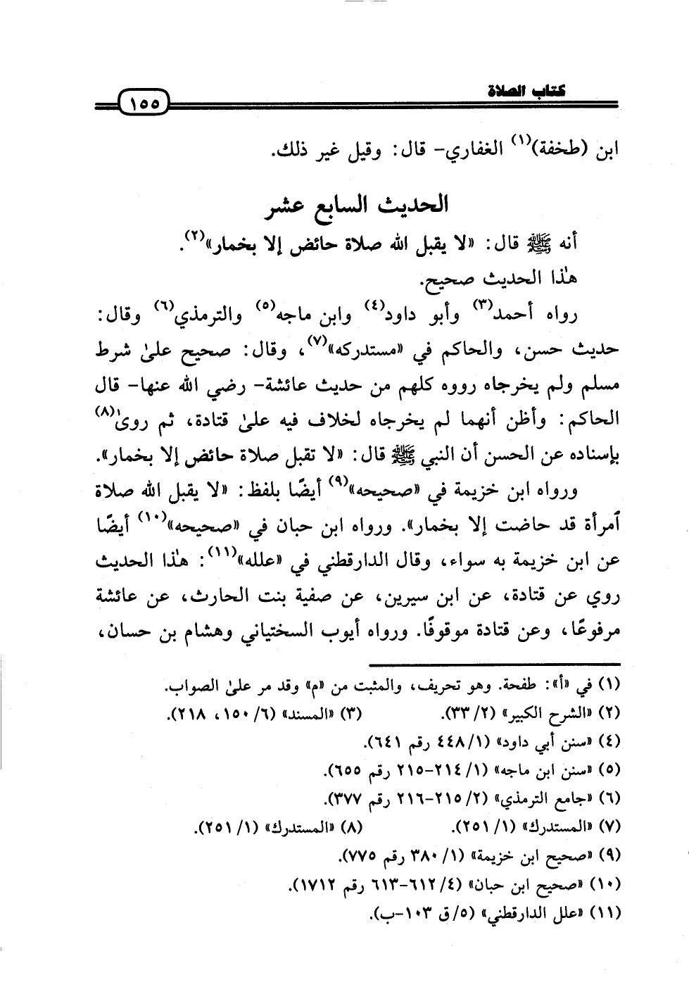 وَرَوَاهُ ابْن خُزَيْمَة فِي «صَحِيحه» أَيْضا بِلَفْظ: «لَا يقبل الله صَلَاة امْرَأَة قد حَاضَت إِلَّا بخمار» . وَرَوَاهُ ابْن حبَان فِي «صَحِيحه» أَيْضا عَن ابْن خُزَيْمَة بِهِ سَوَاء، وَقَالَ الدَّارَقُطْنِيّ فِي «علله» : هَذَا الحَدِيث رُوِيَ عَن قَتَادَة، عَن ابْن سِيرِين، عَن صَفِيَّة بنت الْحَارِث، عَن عَائِشَة مَرْفُوعا، وَعَن قَتَادَة مَوْقُوفا. وَرَوَاهُ أَيُّوب السّخْتِيَانِيّ وَهِشَام بن حسان،