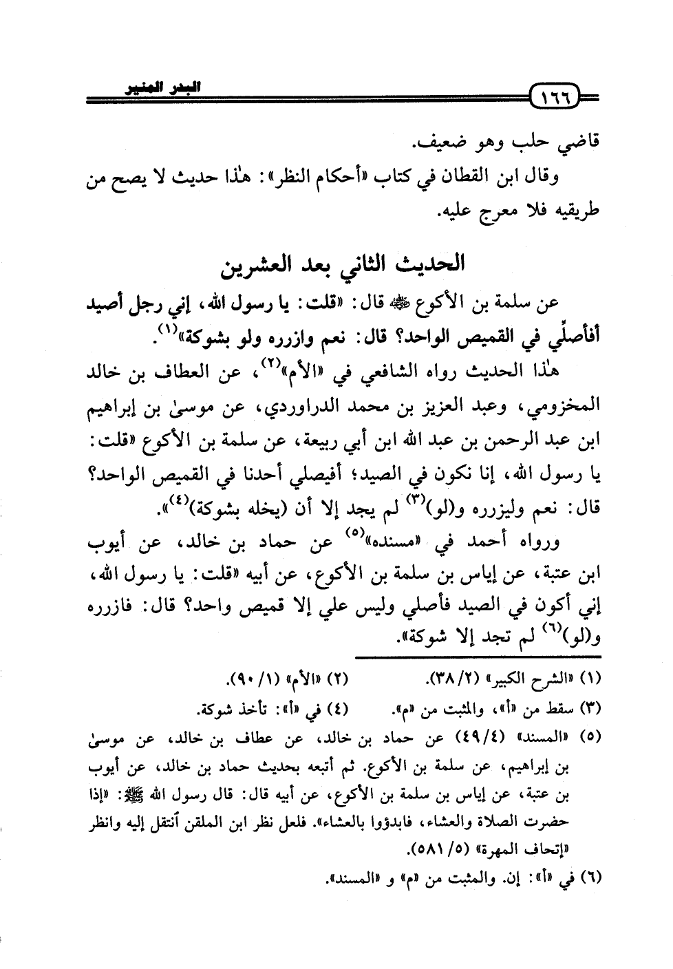هَذَا الحَدِيث رَوَاهُ الشَّافِعِي فِي «الْأُم» ، عَن العطاف بن خَالِد المَخْزُومِي، وَعبد الْعَزِيز بن مُحَمَّد الدَّرَاورْدِي، عَن مُوسَى بن إِبْرَاهِيم بن عبد الرَّحْمَن بن عبد الله ابْن أبي ربيعَة، عَن سَلمَة بن الْأَكْوَع «قلت: يَا رَسُول الله، إِنَّا نَكُون فِي الصَّيْد؛ أفيصلي أَحَدنَا فِي الْقَمِيص الْوَاحِد؟ قَالَ: نعم وليزرره و (لَو) لم يجد إِلَّا أَن (يخله بشوكة) » .