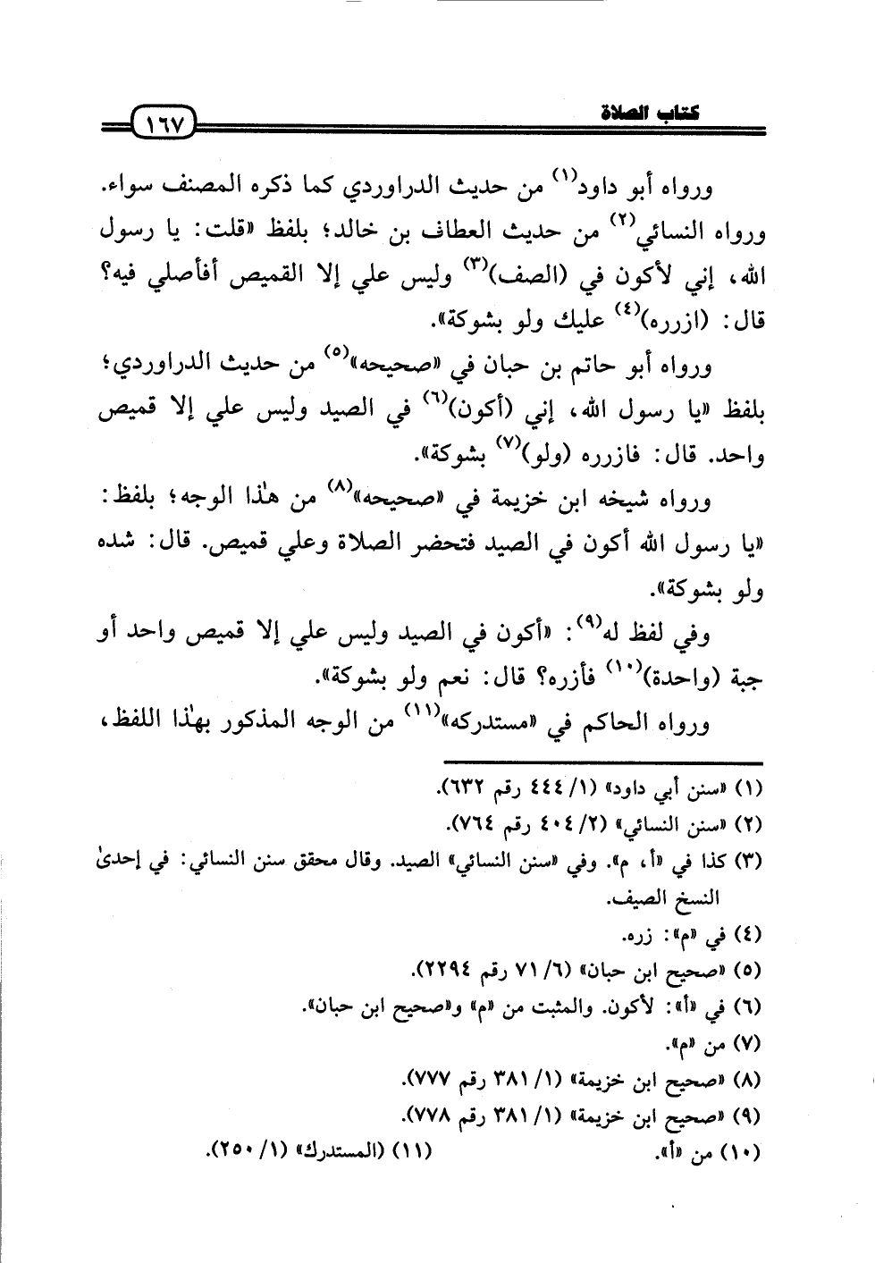 وَرَوَاهُ شَيْخه ابْن خُزَيْمَة فِي «صَحِيحه» من هَذَا الْوَجْه؛ بِلَفْظ: «يَا رَسُول الله أكون فِي الصَّيْد فتحضر الصَّلَاة وَعلي قَمِيص. قَالَ: شده وَلَو بشوكة» .