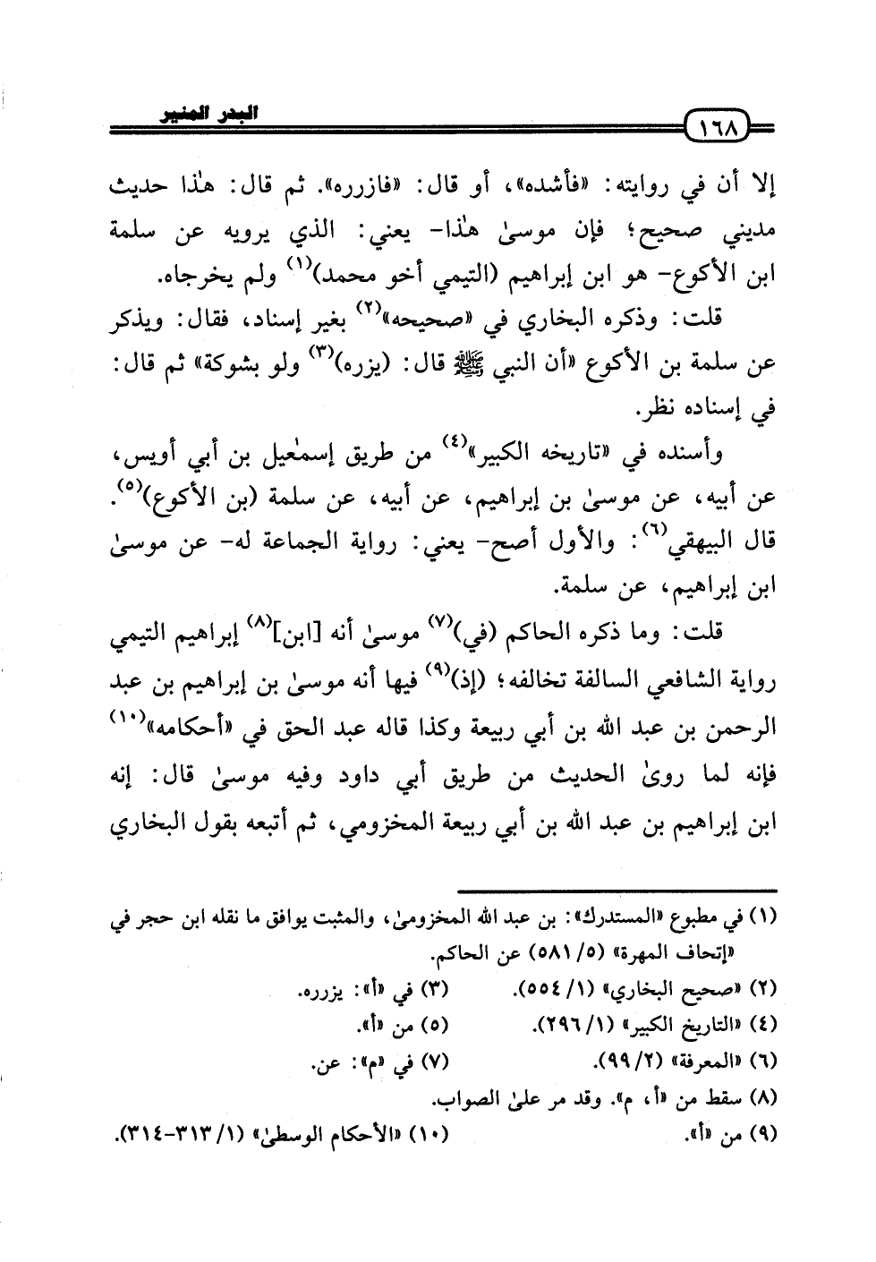 قلت: وَمَا ذكره الْحَاكِم (فِي) مُوسَى أَنه [ابْن] إِبْرَاهِيم التَّيْمِيّ رِوَايَة الشَّافِعِي السالفة تخَالفه؛ (إِذْ) فِيهَا أَنه مُوسَى بن إِبْرَاهِيم بن عبد الرَّحْمَن بن عبد الله بن أبي ربيعَة وَكَذَا قَالَه عبد الْحق فِي «أَحْكَامه» فَإِنَّهُ لما رَوَى الحَدِيث من طَرِيق أبي دَاوُد وَفِيه مُوسَى قَالَ: إِنَّه ابْن إِبْرَاهِيم بن عبد الله بن أبي ربيعَة المَخْزُومِي، ثمَّ أتبعه بقول البُخَارِيّ
