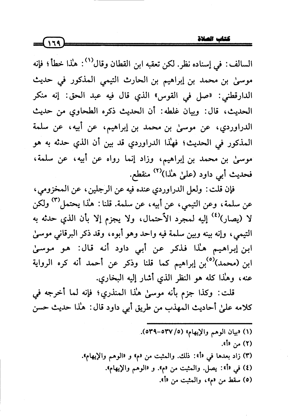 السالف: فِي إِسْنَاده نظر. لَكِن تعقبه ابْن الْقطَّان وَقَالَ: هَذَا خطأ؛ فَإِنَّهُ مُوسَى بن مُحَمَّد بن إِبْرَاهِيم بن الْحَارِث التَّيْمِيّ الْمَذْكُور فِي حَدِيث الدَّارَقُطْنِيّ: «صل فِي الْقوس» الَّذِي قَالَ فِيهِ عبد الْحق: إِنَّه مُنكر الحَدِيث، قَالَ: وَبَيَان غلطه: أَن الحَدِيث ذكره الطَّحَاوِيّ من حَدِيث الدَّرَاورْدِي، عَن مُوسَى بن مُحَمَّد بن إِبْرَاهِيم، عَن أَبِيه، عَن سَلمَة الْمَذْكُور فِي الحَدِيث؛ فَهَذَا الدَّرَاورْدِي قد بَين أَن الَّذِي حَدثهُ بِهِ هُوَ مُوسَى بن مُحَمَّد بن إِبْرَاهِيم، وَزَاد إِنَّمَا رَوَاهُ عَن أَبِيه، عَن سَلمَة، فَحَدِيث أبي دَاوُد (عَلَى هَذَا) مُنْقَطع.