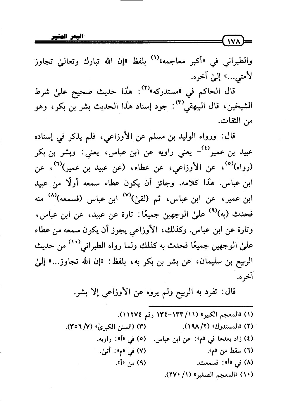 قَالَ: وَرَوَاهُ الْوَلِيد بن مُسلم عَن الْأَوْزَاعِيّ، فَلم يذكر فِي إِسْنَاده عبيد بن عُمَيْر - يَعْنِي رَاوِيه عَن ابْن عَبَّاس، يَعْنِي: وَبشر بن بكر (رَوَاهُ) ، عَن الْأَوْزَاعِيّ، عَن عَطاء، (عَن عبيد بن عُمَيْر) ، عَن ابْن عَبَّاس. هَذَا كَلَامه. وَجَائِز أَن يكون عَطاء سَمعه أَولا من عبيد بن عُمَيْر، عَن ابْن عَبَّاس، ثمَّ (لقى) ابْن عَبَّاس (فَسَمعهُ) مِنْهُ فَحدث (بِهِ) عَلَى الْوَجْهَيْنِ جَمِيعًا: تَارَة عَن عبيد، عَن ابْن عَبَّاس، وَتارَة عَن ابْن عَبَّاس. وَكَذَلِكَ، الْأَوْزَاعِيّ يجوز أَن يكون سَمعه من عَطاء عَلَى الْوَجْهَيْنِ جَمِيعًا فَحدث بِهِ كَذَلِك وَلما رَوَاهُ الطَّبَرَانِيّ من حَدِيث الرّبيع بن سُلَيْمَان، عَن بشر بن بكر بِهِ، بِلَفْظ: «إِن الله تجَاوز ... » إِلَى آخِره.