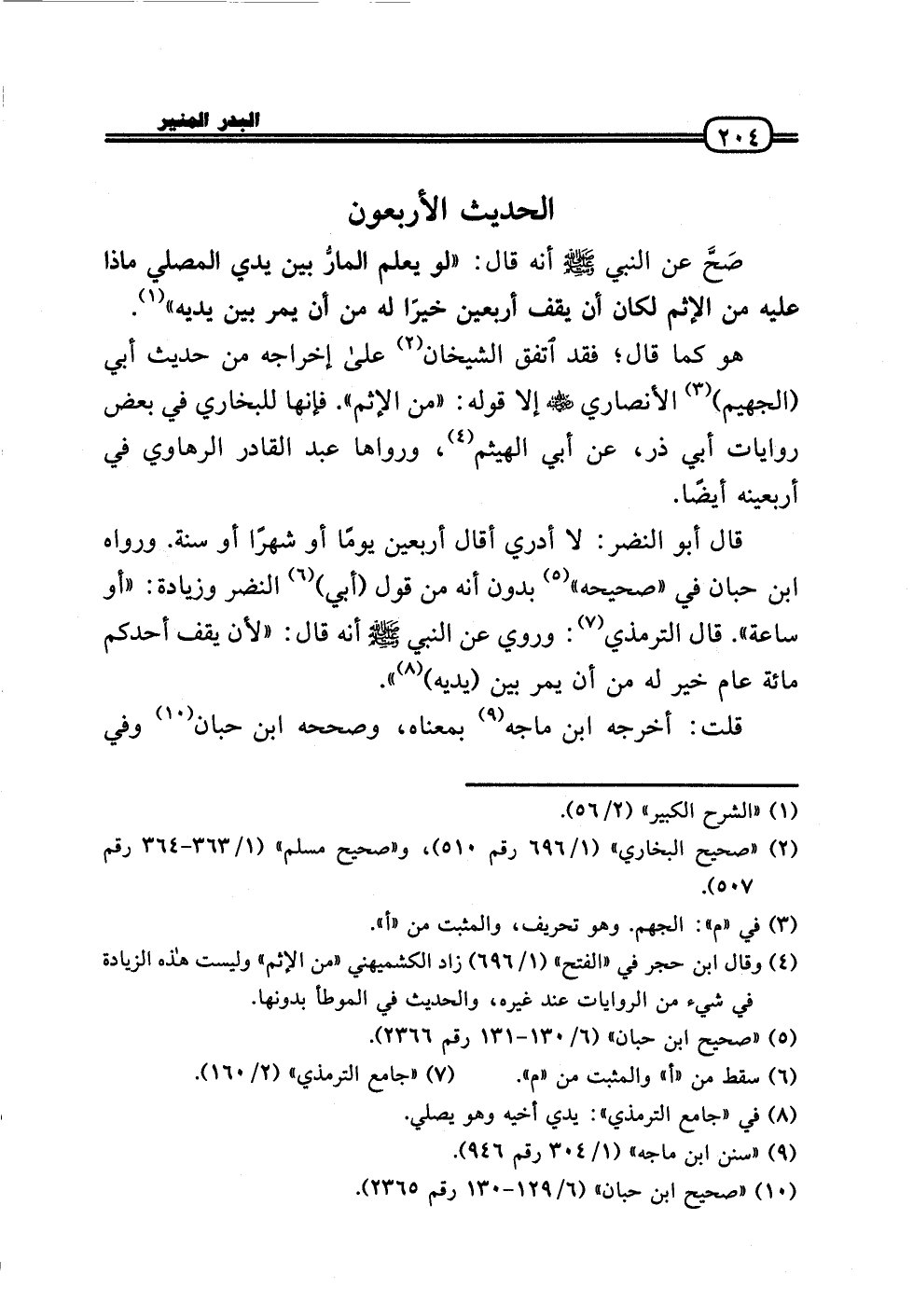 قَالَ أَبُو النَّضر: لَا أَدْرِي أقَال أَرْبَعِينَ يَوْمًا أَو شهرا أَو سنة. وَرَوَاهُ ابْن حبَان فِي «صَحِيحه» بِدُونِ أَنه من قَول (أبي) النَّضر وَزِيَادَة: «أَو سَاعَة» . قَالَ التِّرْمِذِيّ: وَرُوِيَ عَن النَّبِي - صَلَّى الله عَلَيْهِ وَسلم - أَنه قَالَ: «لِأَن يقف أحدكُم مائَة عَام خير لَهُ من أَن يمر بَين (يَدَيْهِ) » .