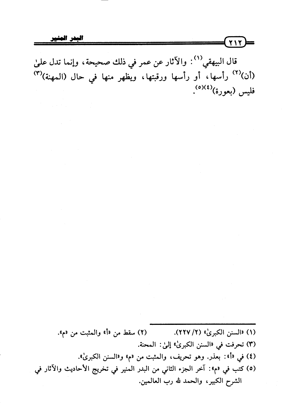 قَالَ الْبَيْهَقِيّ: والْآثَار عَن عمر فِي ذَلِك صَحِيحَة، وَإِنَّمَا تدل عَلَى (أَن) رَأسهَا، أَو رَأسهَا ورقبتها، وَيظْهر مِنْهَا فِي حَال (المهنة) فَلَيْسَ (بِعَوْرَة) .