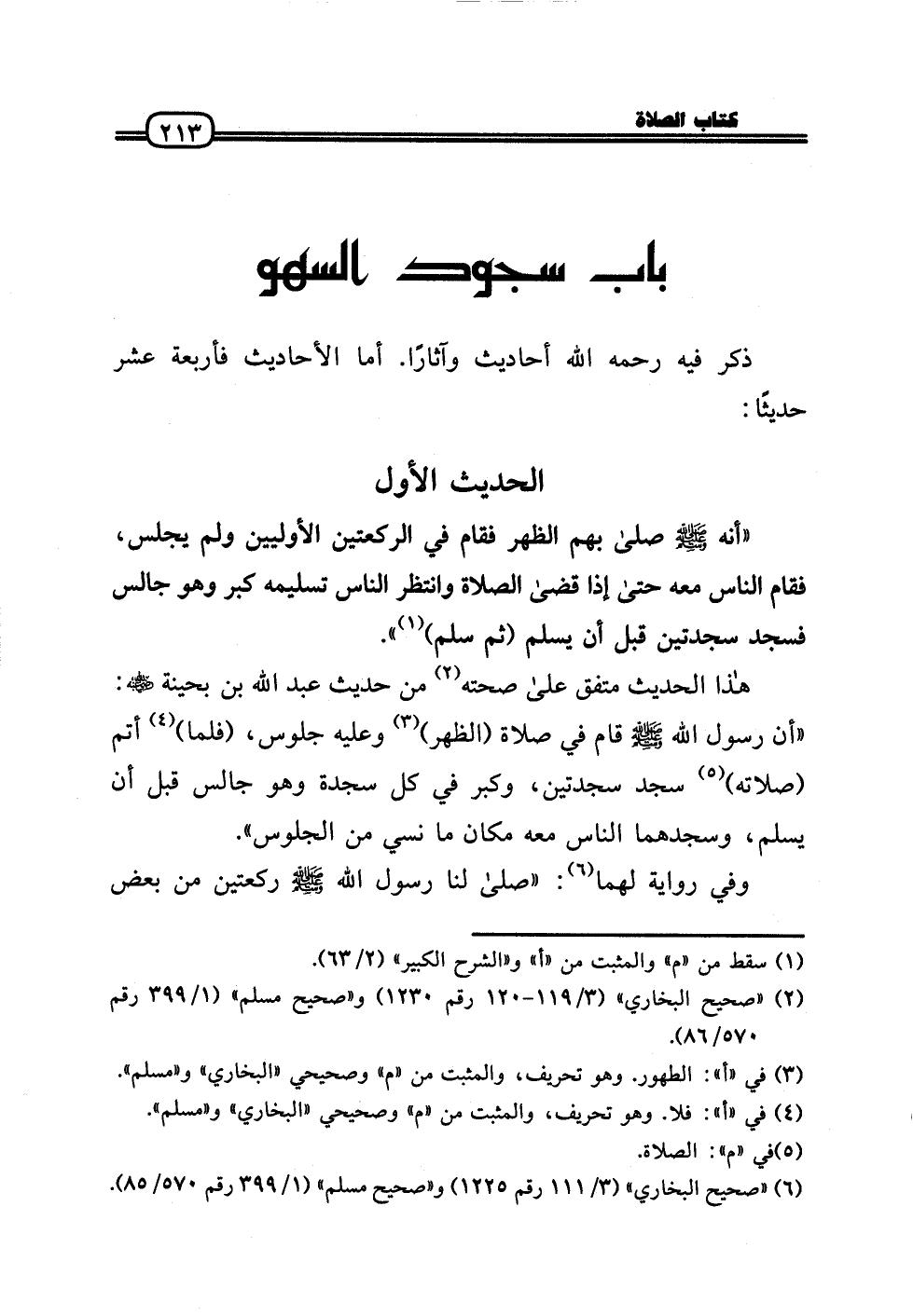 «أنَّه - صَلَّى الله عَلَيْهِ وَسلم - صَلَّى بهم الظّهْر فَقَامَ فِي الرَّكْعَتَيْنِ الْأَوليين وَلم يجلس، فَقَامَ النَّاس مَعَه حَتَّى إِذا قَضَى الصَّلَاة وانتظر النَّاس تَسْلِيمه كبر وَهُوَ جَالس فَسجدَ سَجْدَتَيْنِ قبل أَن يسلم (ثمَّ سلم) » .