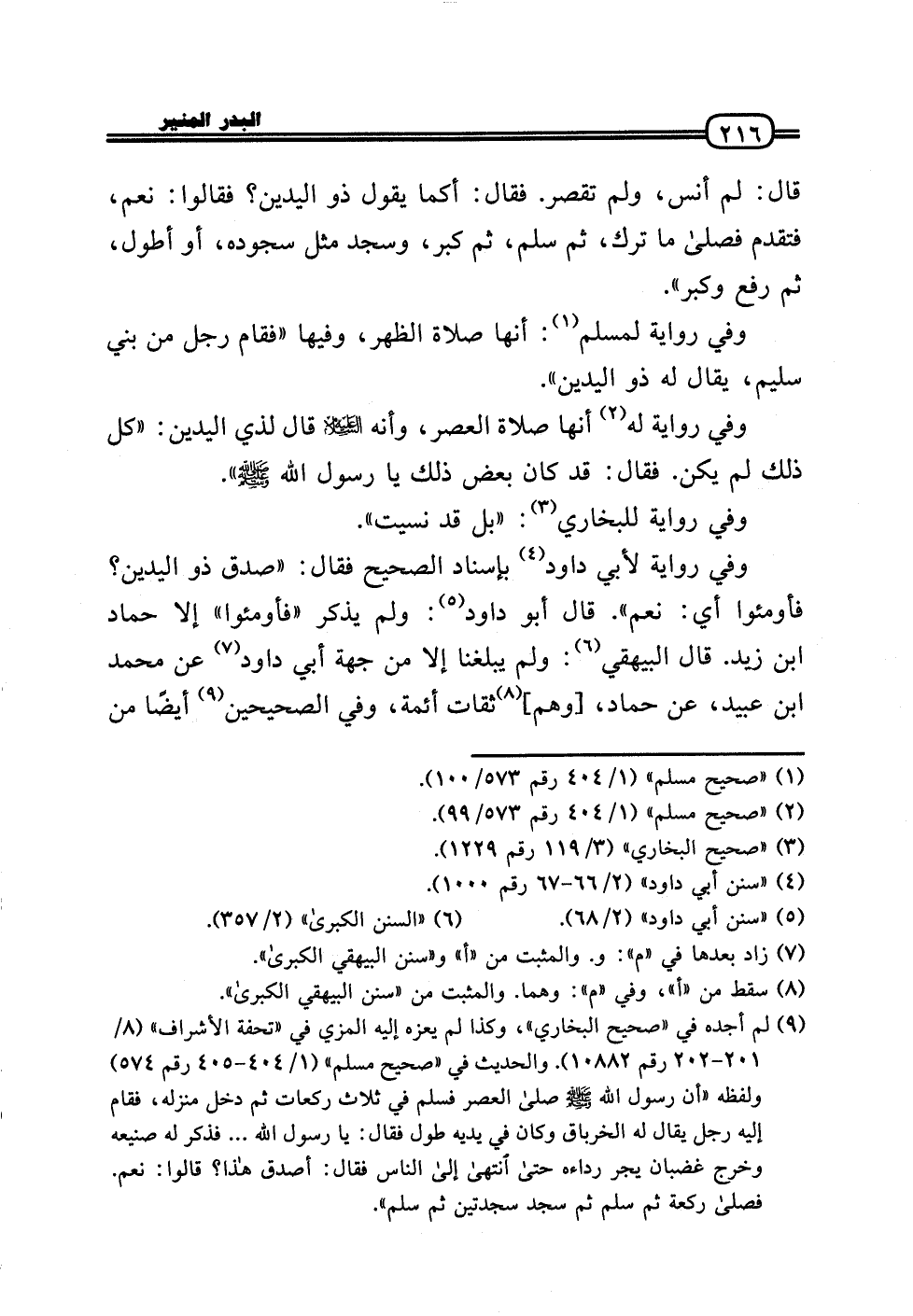 وَفِي رِوَايَة لأبي دَاوُد بِإِسْنَاد الصَّحِيح فَقَالَ: «صدق ذُو الْيَدَيْنِ؟ فَأَوْمَئُوا أَي: نعم» . قَالَ أَبُو دَاوُد: وَلم يذكر «فَأَوْمَئُوا» إِلَّا حَمَّاد بن زيد. قَالَ الْبَيْهَقِيّ: وَلم يبلغنَا إِلَّا من جِهَة أبي دَاوُد عَن مُحَمَّد بن عبيد، عَن حَمَّاد، [وهم] ثِقَات أَئِمَّة، وَفِي الصَّحِيحَيْنِ أَيْضا من
