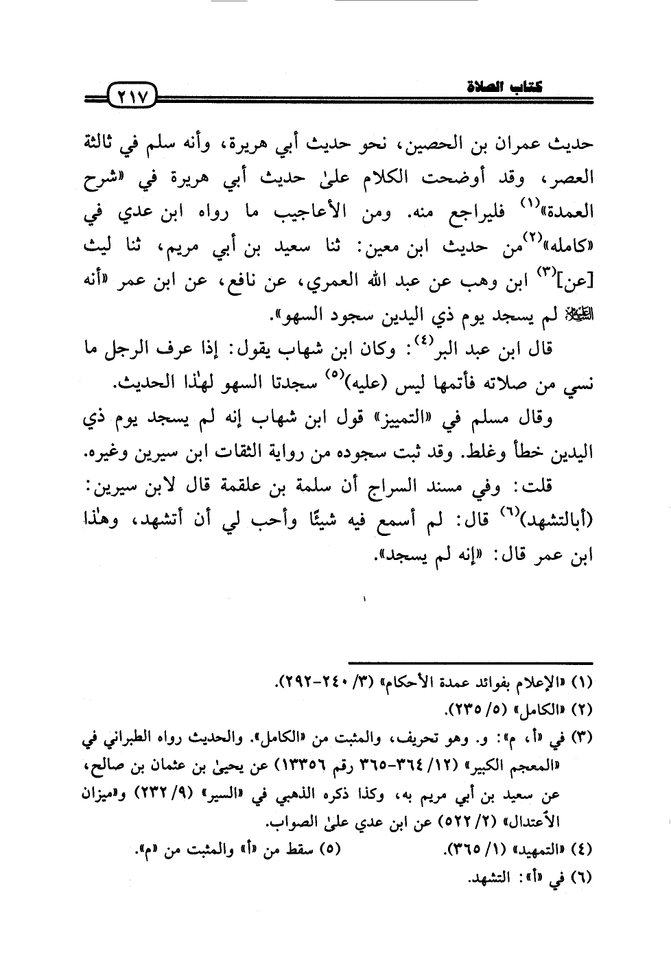 حَدِيث عمرَان بن الْحصين، نَحْو حَدِيث أبي هُرَيْرَة، وَأَنه سلم فِي ثَالِثَة الْعَصْر، وَقد أوضحت الْكَلَام عَلَى حَدِيث أبي هُرَيْرَة فِي «شرح الْعُمْدَة» فَليُرَاجع مِنْهُ. وَمن الْأَعَاجِيب مَا رَوَاهُ ابْن عدي فِي «كَامِله» من حَدِيث ابْن معِين: ثَنَا سعيد بن أبي مَرْيَم، ثَنَا لَيْث [عَن] ابْن وهب عَن عبد الله الْعمريّ، عَن نَافِع، عَن ابْن عمر «أَنه عَلَيْهِ السَّلَام لم يسْجد يَوْم ذِي الْيَدَيْنِ سُجُود السَّهْو» .