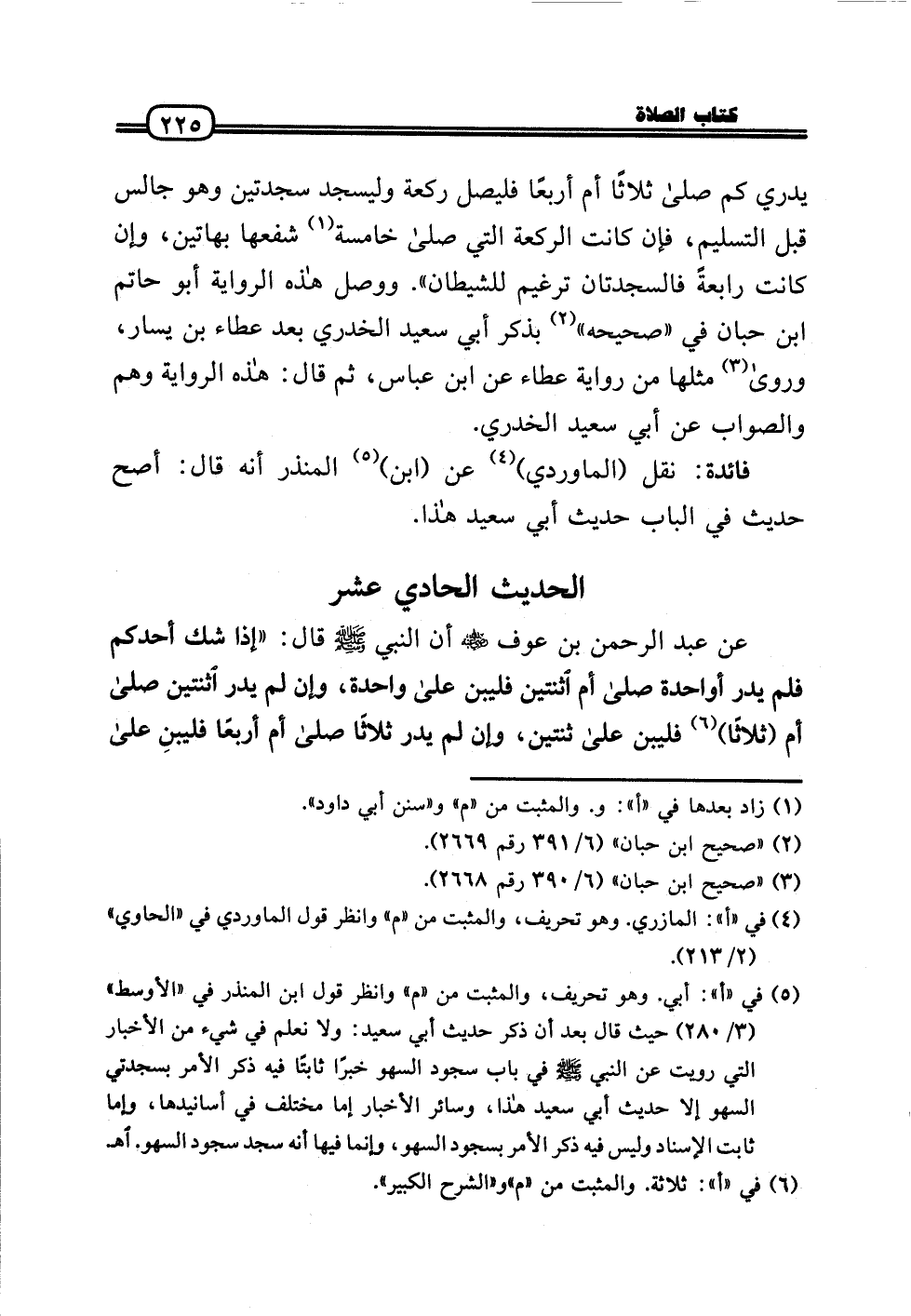 عَن عبد الرَّحْمَن بن عَوْف رَضِيَ اللَّهُ عَنْه أَن النَّبِي - صَلَّى الله عَلَيْهِ وَسلم - قَالَ: «إِذْ شكّ أحدكُم فَلم يدر أواحدة صَلَّى أم اثْنَتَيْنِ فليبن عَلَى وَاحِدَة، وَإِن لم يدر اثْنَتَيْنِ صَلَّى أم (ثَلَاثًا) فليبن عَلَى ثِنْتَيْنِ، وَإِن لم يدر ثَلَاثًا صَلَّى أم أَرْبعا فليبنِ عَلَى