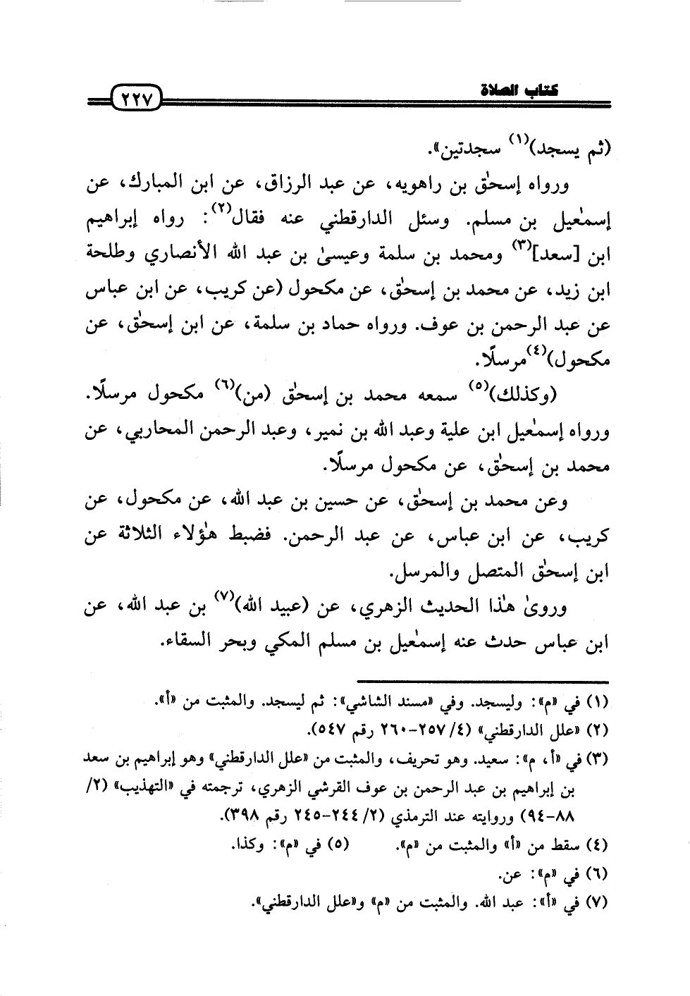وَرَوَاهُ إِسْحَاق بن رَاهَوَيْه، عَن عبد الرَّزَّاق، عَن ابْن الْمُبَارك، عَن إِسْمَاعِيل بن مُسلم. وَسُئِلَ الدَّارَقُطْنِيّ عَنهُ فَقَالَ: رَوَاهُ إِبْرَاهِيم بن [سعد] وَمُحَمّد بن سَلمَة وَعِيسَى بن عبد الله الْأنْصَارِيّ وَطَلْحَة بن زيد، عَن مُحَمَّد بن إِسْحَاق، عَن مَكْحُول (عَن كريب، عَن ابْن عَبَّاس عَن عبد الرَّحْمَن بن عَوْف. وَرَوَاهُ حَمَّاد بن سَلمَة، عَن ابْن إِسْحَاق، عَن مَكْحُول) مُرْسلا.