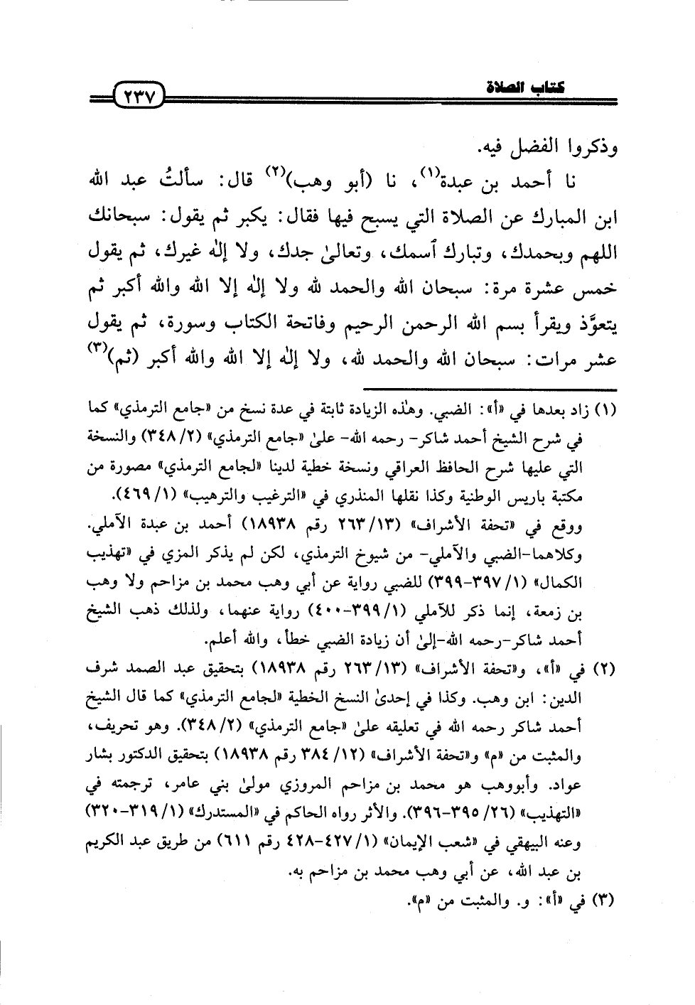 نَا أَحْمد بن عَبدة، نَا (أَبُو وهب) قَالَ: سألتُ عبد الله بن الْمُبَارك عَن الصَّلَاة الَّتِي يسبح فِيهَا فَقَالَ: يكبر ثمَّ يَقُول: سُبْحَانَكَ اللَّهُمَّ وَبِحَمْدِك، وتبارك اسْمك، وَتَعَالَى جدك، وَلَا إِلَه غَيْرك، ثمَّ يَقُول خمس عشرَة مرّة: سُبْحَانَ الله وَالْحَمْد لله وَلَا إِلَه إِلَّا الله وَالله أكبر ثمَّ يتعوَّذ وَيقْرَأ بِسم الله الرَّحْمَن الرَّحِيم وفاتحة الْكتاب وَسورَة، ثمَّ يَقُول عشر مَرَّات: سُبْحَانَ الله وَالْحَمْد لله، وَلَا إِلَه إِلَّا الله وَالله أكبر (ثمَّ)