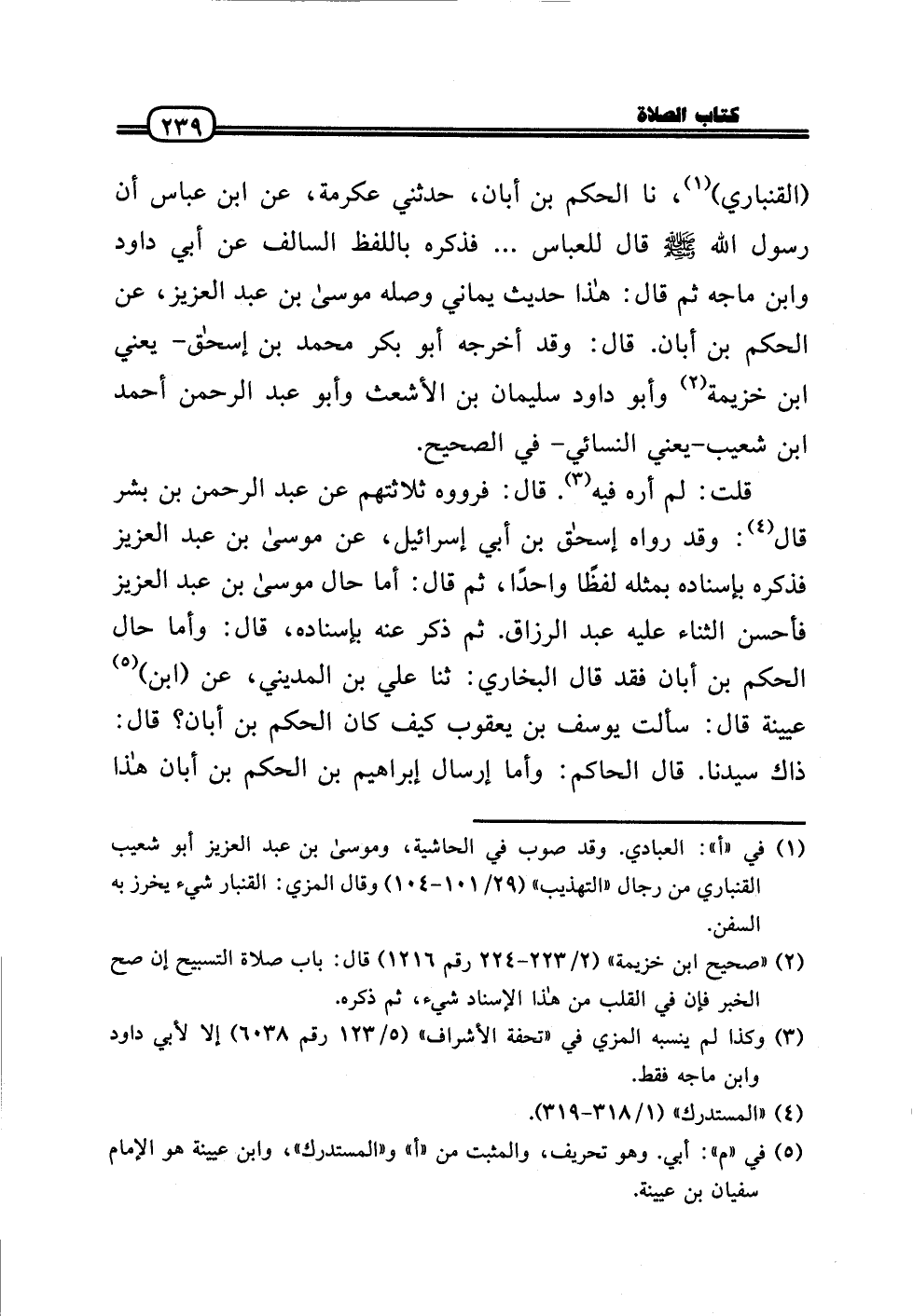 (القنباري) ، نَا الحكم بن أبان، حَدثنِي عِكْرِمَة، عَن ابْن عَبَّاس أَن رَسُول الله - صَلَّى الله عَلَيْهِ وَسلم - قَالَ للْعَبَّاس ... فَذكره بِاللَّفْظِ السالف عَن أبي دَاوُد وَابْن مَاجَه ثمَّ قَالَ: هَذَا حَدِيث يماني وَصله مُوسَى بن عبد الْعَزِيز، عَن الحكم بن أبان. قَالَ: وَقد أخرجه أَبُو بكر مُحَمَّد بن إِسْحَاق - يَعْنِي ابْن خُزَيْمَة وَأَبُو دَاوُد سُلَيْمَان بن الْأَشْعَث وَأَبُو عبد الرَّحْمَن أَحْمد بن شُعَيْب - يَعْنِي النَّسَائِيّ - فِي الصَّحِيح.
