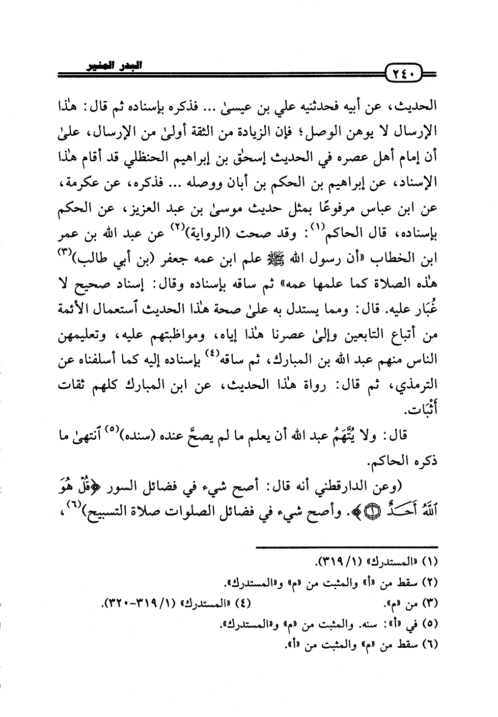 الحَدِيث، عَن أَبِيه فَحَدَّثَنِيهِ عَلّي بن عِيسَى ... فَذكره بِإِسْنَادِهِ ثمَّ قَالَ: هَذَا الْإِرْسَال لَا يوهن الْوَصْل؛ فَإِن الزِّيَادَة من الثِّقَة أولَى من الْإِرْسَال، عَلَى أَن إِمَام أهل عصره فِي الحَدِيث إِسْحَاق بن إِبْرَاهِيم الْحَنْظَلِي قد أَقَامَ هَذَا الْإِسْنَاد، عَن إِبْرَاهِيم بن الحكم بن أبان وَوَصله ... فَذكره، عَن عِكْرِمَة، عَن ابْن عَبَّاس مَرْفُوعا بِمثل حَدِيث مُوسَى بن عبد الْعَزِيز، عَن الحكم بِإِسْنَادِهِ، قَالَ الْحَاكِم: وَقد صحت (الرِّوَايَة) عَن عبد الله بن عمر بن الْخطاب «أَن رَسُول الله - صَلَّى الله عَلَيْهِ وَسلم - علم ابْن عَمه جَعْفَر (بن أبي طَالب) هَذِه الصَّلَاة كَمَا علمهَا عَمه» ثمَّ سَاقه بِإِسْنَادِهِ وَقَالَ: إِسْنَاد صَحِيح لَا غُبَار عَلَيْهِ. قَالَ: وَمِمَّا يسْتَدلّ بِهِ عَلَى صِحَة هَذَا الحَدِيث اسْتِعْمَال الْأَئِمَّة من أَتبَاع التَّابِعين وَإِلَى عصرنا هَذَا إِيَّاه، ومواظبتهم عَلَيْهِ، وتعليمهن النَّاس مِنْهُم عبد الله بن الْمُبَارك، ثمَّ سَاقه بِإِسْنَادِهِ إِلَيْهِ كَمَا أسلفناه عَن التِّرْمِذِيّ، ثمَّ قَالَ: رُوَاة هَذَا الحَدِيث، عَن ابْن الْمُبَارك كلهم ثِقَات أَثْبَات.