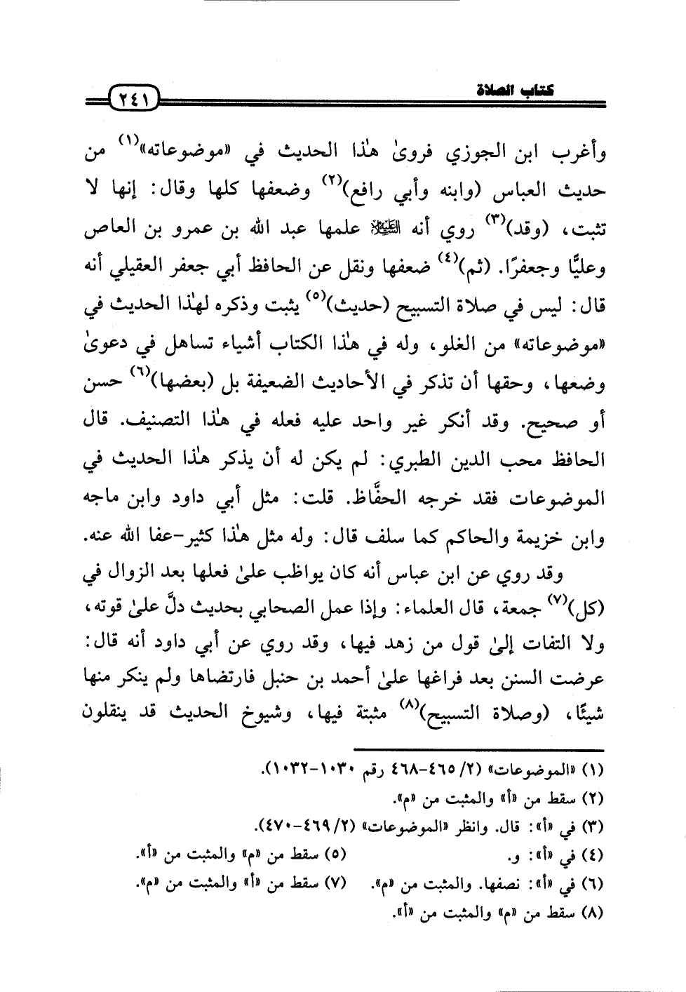 وَأغْرب ابْن الْجَوْزِيّ فروَى هَذَا الحَدِيث فِي «مَوْضُوعَاته» من حَدِيث الْعَبَّاس (وَابْنه وَأبي رَافع) وضعفها كلهَا وَقَالَ: إِنَّهَا لَا تثبت، (وَقد) رُوِيَ أَنه عَلَيْهِ السَّلَام علمهَا عبد الله بن عَمْرو بن الْعَاصِ وعليًّا وجعفرًا. (ثمَّ) ضعفها وَنقل عَن الْحَافِظ أبي جَعْفَر الْعقيلِيّ أَنه قَالَ: لَيْسَ فِي صَلَاة التَّسْبِيح (حَدِيث) يثبت وَذكره لهَذَا الحَدِيث فِي «مَوْضُوعَاته» من الغلو، وَله فِي هَذَا الْكتاب أَشْيَاء تساهل فِي دَعْوَى وَضعهَا، وحقها أَن تذكر فِي الْأَحَادِيث الضعيفة بل (بَعْضهَا) حسن أَو صَحِيح. وَقد أنكر غير وَاحِد عَلَيْهِ فعله فِي هَذَا التصنيف. قَالَ الْحَافِظ محب الدَّين الطَّبَرِيّ: لم يكن لَهُ أَن يذكر هَذَا الحَدِيث فِي الموضوعات فقد خرجه الحفَّاظ. قلت: مثل أبي دَاوُد وَابْن مَاجَه وَابْن خُزَيْمَة وَالْحَاكِم كَمَا سلف قَالَ: وَله مثل هَذَا كثير - عَفا الله عَنهُ.