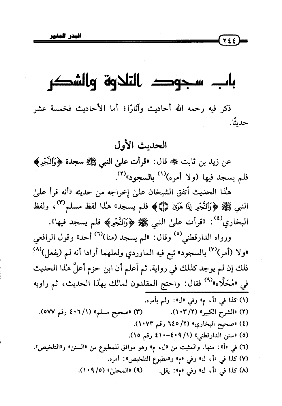 عَن زيد بن ثَابت رَضِيَ اللَّهُ عَنْه قَالَ: «قَرَأت عَلَى النَّبِي - صَلَّى الله عَلَيْهِ وَسلم - سَجْدَة (والنجم (فَلم يسْجد فِيهَا (وَلَا أمره) بِالسُّجُود» .