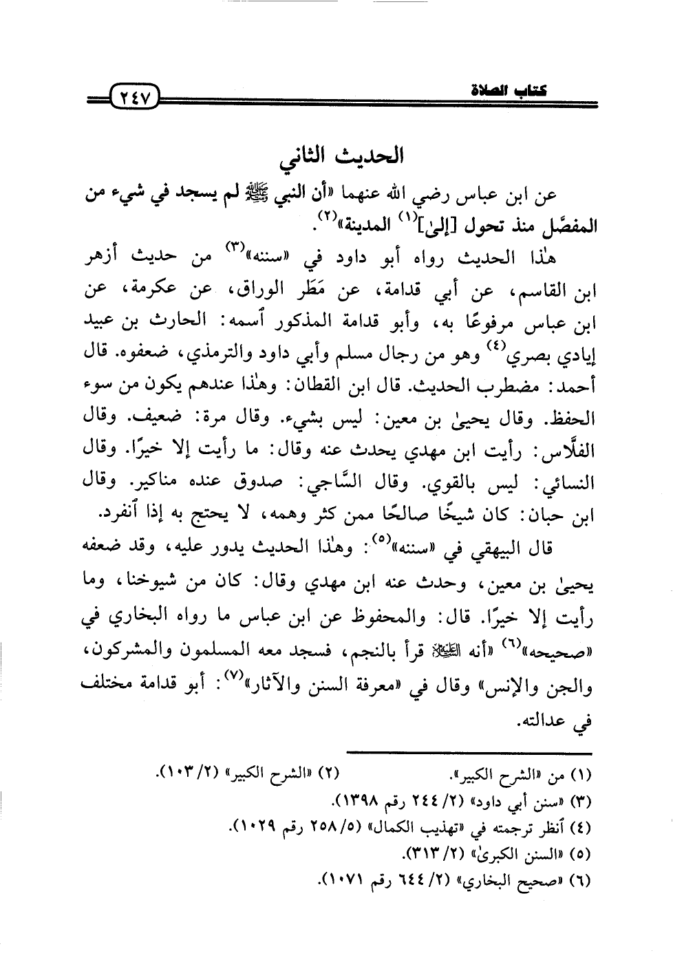 قَالَ الْبَيْهَقِيّ فِي «سنَنه» : وَهَذَا الحَدِيث يَدُور عَلَيْهِ، وَقد ضعفه يَحْيَى بن معِين، وَحدث عَنهُ ابْن مهْدي وَقَالَ: كَانَ من شُيُوخنَا، وَمَا رَأَيْت إِلَّا خيرا. قَالَ: وَالْمَحْفُوظ عَن ابْن عَبَّاس مَا رَوَاهُ البُخَارِيّ فِي «صَحِيحه» «أَنه عَلَيْهِ السَّلَام قَرَأَ بِالنَّجْمِ، فَسجدَ مَعَه الْمُسلمُونَ وَالْمُشْرِكُونَ، وَالْجِنّ وَالْإِنْس» وَقَالَ فِي «معرفَة السّنَن والْآثَار» : أَبُو قدامَة مُخْتَلف فِي عَدَالَته.