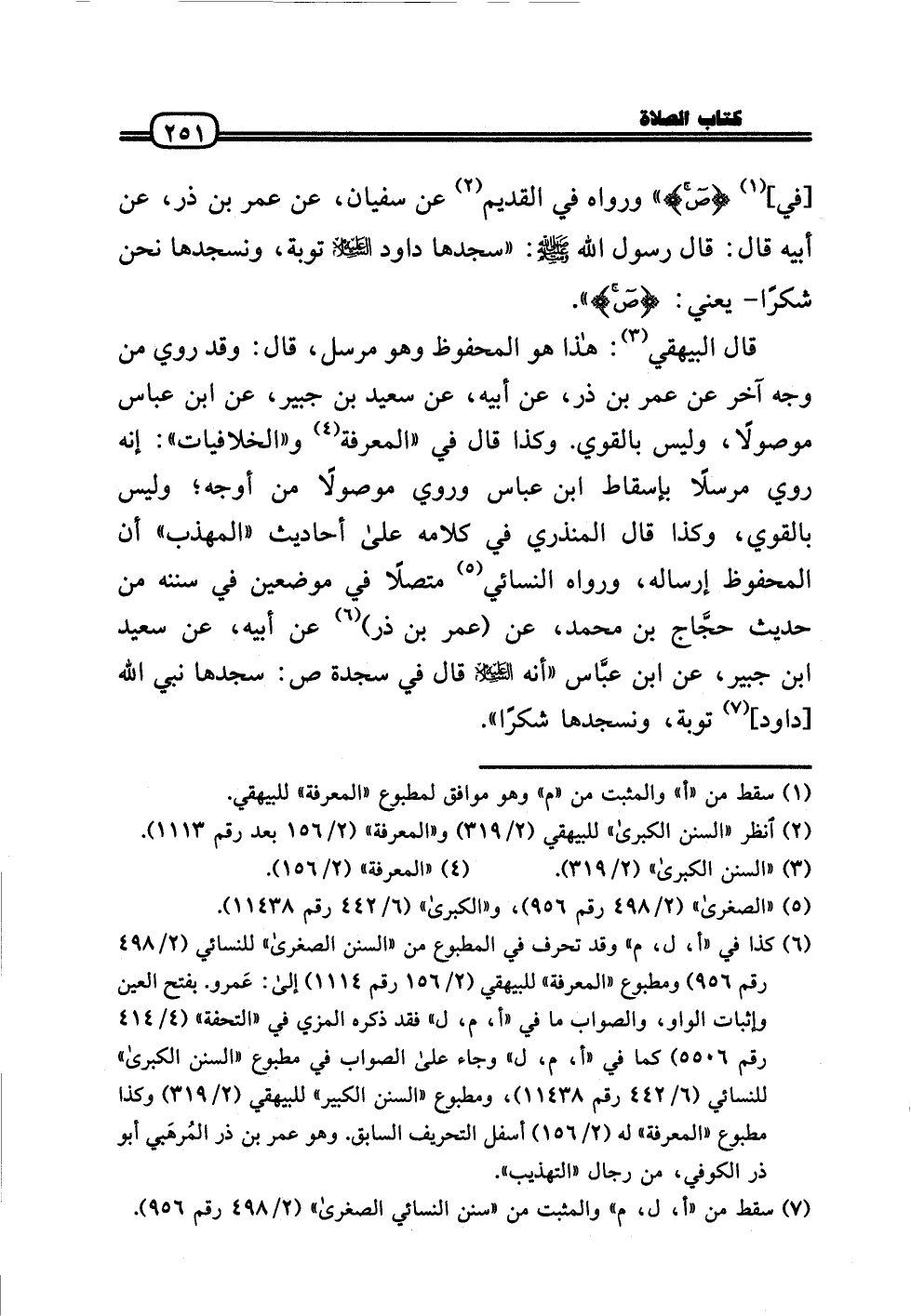 قَالَ الْبَيْهَقِيّ: هَذَا هُوَ الْمَحْفُوظ وَهُوَ مُرْسل، قَالَ: وَقد رُوِيَ من وَجه آخر عَن عمر بن ذَر، عَن أَبِيه، عَن سعيد بن جُبَير، عَن ابْن عَبَّاس مَوْصُولا، وَلَيْسَ بِالْقَوِيّ. وَكَذَا قَالَ فِي «الْمعرفَة و (الخلافيات» : إِنَّه رُوِيَ مُرْسلا بِإِسْقَاط ابْن عَبَّاس وَرُوِيَ مَوْصُولا من أوجه؛ وَلَيْسَ بِالْقَوِيّ، وَكَذَا قَالَ الْمُنْذِرِيّ فِي كَلَامه عَلَى أَحَادِيث «الْمُهَذّب» أَن الْمَحْفُوظ إرْسَاله، وَرَوَاهُ النَّسَائِيّ مُتَّصِلا فِي موضِعين فِي سنَنه من حَدِيث حجَّاج بن مُحَمَّد، عَن (عمر بن ذَر) عَن أَبِيه، عَن سعيد بن جُبَير، عَن ابْن عبَّاس «أَنه عَلَيْهِ السَّلَام قَالَ فِي سَجْدَة ص: سجدها نَبِي الله [دَاوُد] تَوْبَة، ونسجدها شكرا» .