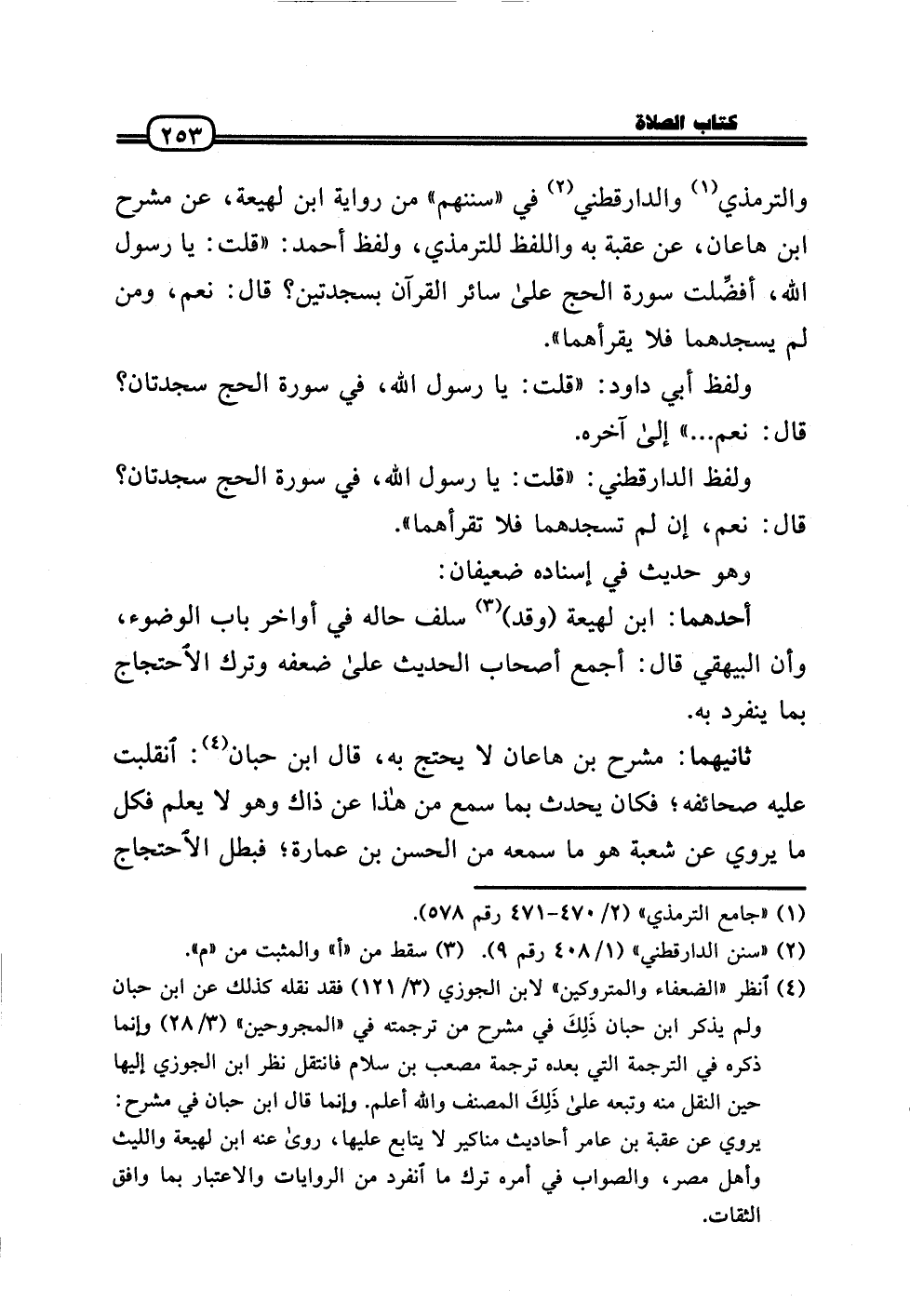 وَالتِّرْمِذِيّ وَالدَّارَقُطْنِيّ فِي (سُنَنهمْ) من رِوَايَة ابْن لَهِيعَة، عَن مشرح بن هاعان، عَن عقبَة بِهِ وَاللَّفْظ لِلتِّرْمِذِي، وَلَفظ أَحْمد: «قلت: يَا رَسُول الله، أفضِّلت سُورَة الْحَج عَلَى سَائِر الْقُرْآن بسجدتين؟ قَالَ: نعم، وَمن لم يسجدهما فَلَا يقرأهما» .