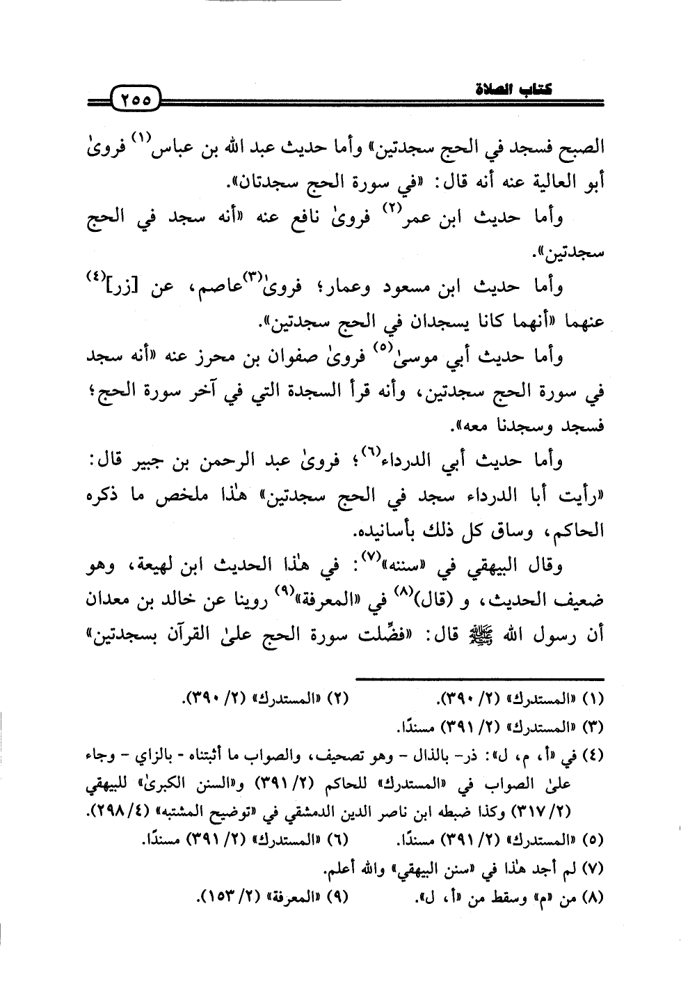 وَأما حَدِيث أبي الدَّرْدَاء؛ فروَى عبد الرَّحْمَن بن جُبَير قَالَ: «رَأَيْت أَبَا الدَّرْدَاء سجد فِي الْحَج سَجْدَتَيْنِ» هَذَا ملخص مَا ذكره الْحَاكِم، وسَاق كل ذَلِك بأسانيده.