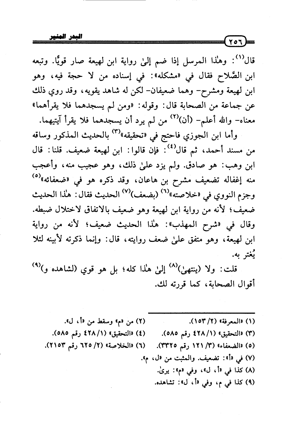 قَالَ: وَهَذَا الْمُرْسل إِذا ضم إِلَى رِوَايَة ابْن لَهِيعَة صَار قويًّا. وَتَبعهُ ابْن الصَّلاح فَقَالَ فِي «مشكله» : فِي إِسْنَاده من لَا حجَّة فِيهِ، وَهُوَ ابْن لَهِيعَة ومشرح - وهما ضعيفان - لَكِن لَهُ شَاهد يقويه، وَقد رُوِيَ ذَلِك عَن جمَاعَة من الصَّحَابَة قَالَ: وَقَوله: «وَمن لم يسجدهما فَلَا يقرأهما» مَعْنَاهُ - وَالله أعلم - (أَن) من لم يرد أَن يسجدهما فَلَا يقْرَأ آيتيهما.