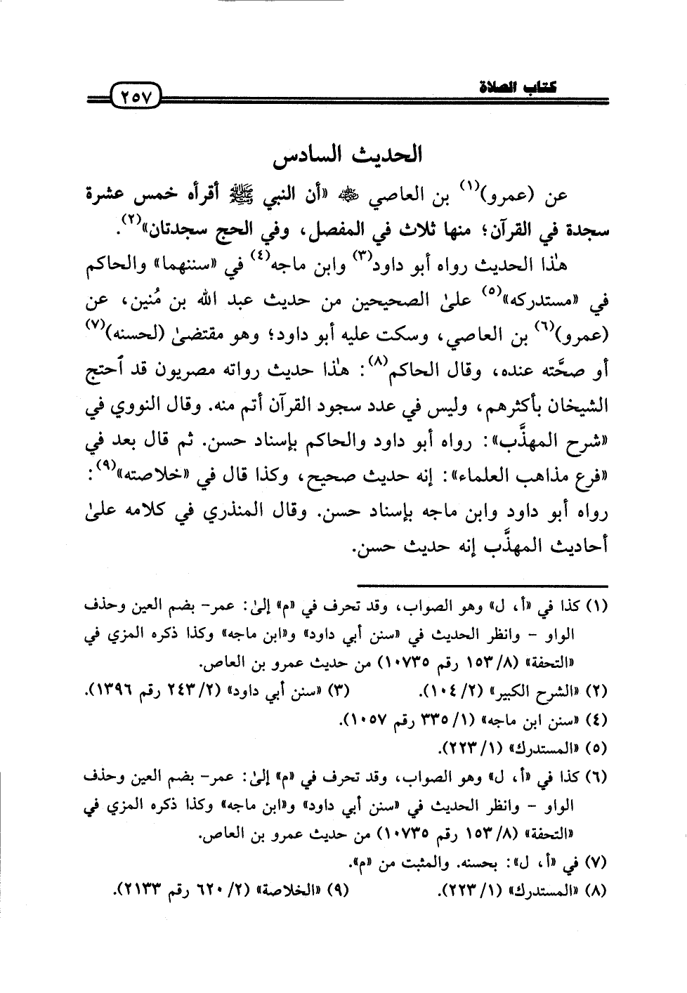 عَن (عَمْرو) بن العَاصِي رَضِيَ اللَّهُ عَنْه «أَن النَّبِي - صَلَّى الله عَلَيْهِ وَسلم - أقرأه خمس عشرَة سَجْدَة فِي الْقُرْآن؛ مِنْهَا ثَلَاث فِي الْمفصل، وَفِي الْحَج سَجْدَتَانِ» .