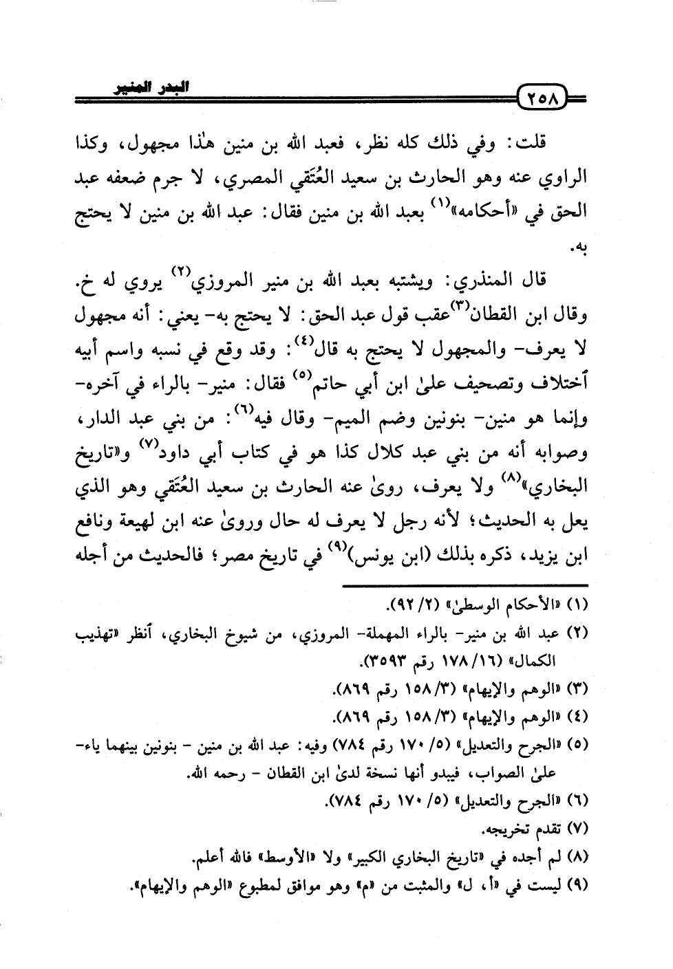قلت: وَفِي ذَلِك كُله نظر، فعبد الله بن منين هَذَا مَجْهُول، وَكَذَا الرَّاوِي عَنهُ وَهُوَ الْحَارِث بن سعيد العُتَقي الْمصْرِيّ، لَا جرم ضعفه عبد الْحق فِي «أَحْكَامه» بِعَبْد الله بن منين فَقَالَ: عبد الله بن منين لَا يحْتَج بِهِ.