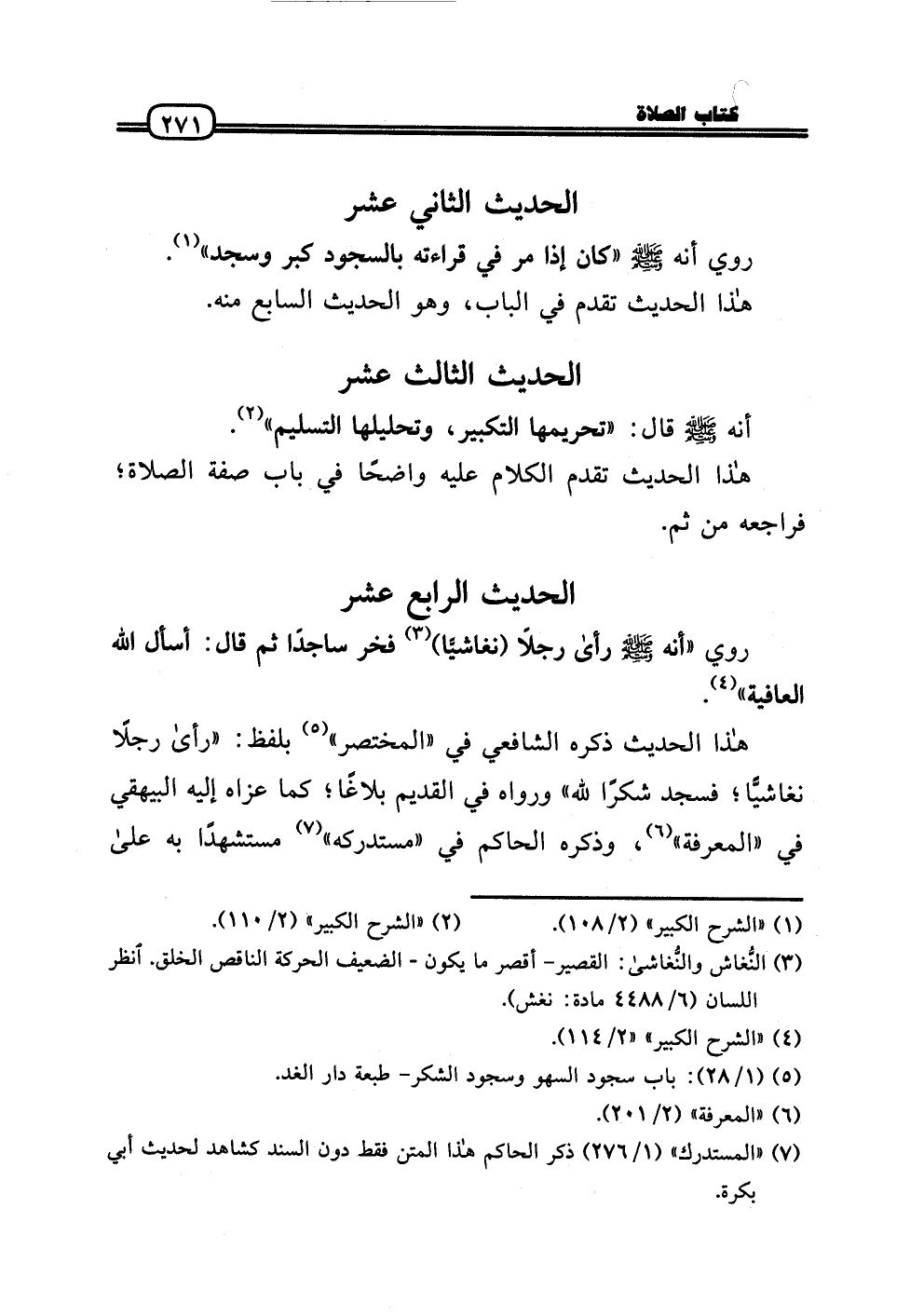 هَذَا الحَدِيث ذكره الشَّافِعِي فِي «الْمُخْتَصر» بِلَفْظ: «رَأَى رجلا نغاشيًّا؛ فَسجدَ شكرا لله» وَرَوَاهُ فِي الْقَدِيم بلاغًا؛ كَمَا عزاهُ إِلَيْهِ الْبَيْهَقِيّ فِي «الْمعرفَة» ، وَذكره الْحَاكِم فِي «مُسْتَدْركه» مستشهدًا بِهِ عَلَى