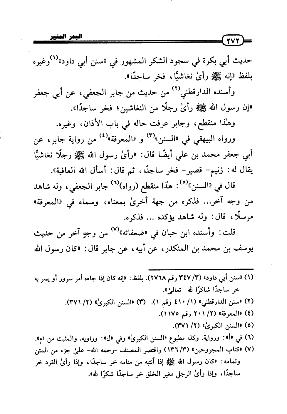 حَدِيث أبي بكرَة فِي سُجُود الشُّكْر الْمَشْهُور فِي «سنَن أبي دَاوُد» وَغَيره بِلَفْظ «إنَّه - صَلَّى الله عَلَيْهِ وَسلم - رَأَى نغاشيًّا، فَخر سَاجِدا» .